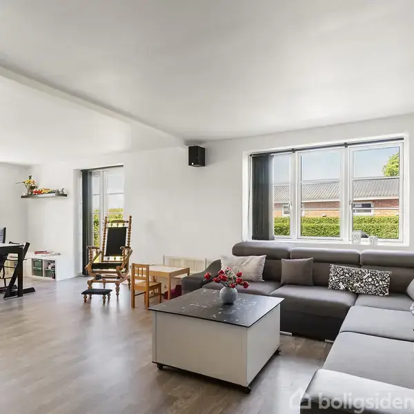 En velholdt og indflytningsklar ejendom i tre plan, hvor plads, funktionalitet og naturskøn beliggenhed går op i en højere enhed. Her får du en bolig, der både rummer gode løsninger til den store familie og et udemiljø, som indbyder til afslapning og leg – alt sammen med en smuk udsigt over åbne marker.Når du træder indenfor, bliver du mødt af en rummelig entré, der fungerer som fordelingsgang til boligens centrale rum. Herfra er der adgang til et lyst og praktisk badeværelse, et funktionelt bry