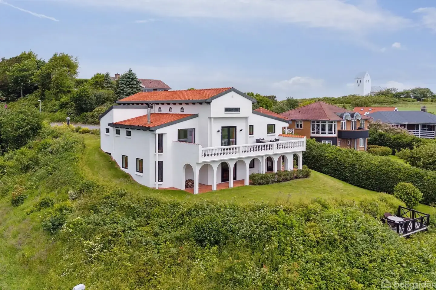 På Sejbjerg 55 i Nørre Nissum møder I en helt særlig ejendom, som med sit arkitektoniske og spanske udtryk og sin beliggenhed forener elegance, sjæl og naturoplevelser. Huset er opført i 1994 og fremstår i klassisk spansk stil med hvide facader, røde tegltag og smukke buede arkader, der giver boligen et næsten sydlandsk præg. Boligen byder på 249 m² fordelt på to plan, hvor hvert plan meget praktisk har sit eget badeværelse, hvilket gør hverdagen ekstra bekvem. I underetagen ligger tre af husets fire værelser sammen med bryggers, badeværelse og en rummelig stue med udgang til den overdækkede terrasse. Herfra er der videre adgang til haven og en hyggelig lille træterrasse, som er anlagt på den bakkede grund - perfekt til at nyde udsigten over de grønne omgivelser. På øverste plan finder man husets sidste værelse samt det store opholdsrum med køkken, spisestue og stue i ét. Igennem hele ejendommen er stilen gennemført og klassisk - med de varme klinkegulve, buede detaljer og lyse rum, der fremhæver husets arkitektoniske linjer. I stuen strømmer lyset ind gennem de store vinduespartier, og brændeovnen sørger for hygge på kølige aftener. Flere steder er der udgang til terrasser og altaner, hvor udsigten kan nydes fra første parket. Og netop udsigten er en historie for sig. Fra boligen og grunden har I panoramaudsigt over det åbne landskab, hvor marker, skov og fjern horisont danner en levende kulisse, som ændrer karakter med årstiderne. I haven er der god plads til udeliv, og den store overdækkede terrasse under arkaderne giver perfekte rammer til både sommermiddage og stille stunder i læ for vinden. Kort sagt får I her en villa, som ikke bare er en bolig - men en oplevelse i sig selv. En ejendom med en stil og karakter, man sjældent ser i Danmark, og som samtidig er placeret i rolige og naturskønne omgivelser tæt på Nørre Nissums faciliteter og kort kørsel fra Lemvig. Nørre Nissum er et hyggeligt lokalsamfund, hvor I reelt finder alt, hvad I skal bruge. Der er kort gåafstand til den lokale købmand, og ser I uden for byskiltet, har I fine forbindelser til de omkringliggende byer - herunder Lemvig og Struer. Derudover mangler man ikke pasningstilbud, man finder nemlig alt fra vuggestue til efterskole. Derudover har byen også en HF-udannelse. Foreningslivet er også noget af den charme, som man får med i handlen i de her lokalsamfund. Med idrætshallen og byens mange fritidstilbud scorer Nørre Nissum højt på familievenlighed, mens naturopleverne venter i Klosterheden og ved Limfjorden. Den her ejendom skal bare opleves, kontakt EDC i Lemvig for en fremvisning på telefon 96 63 40 00.