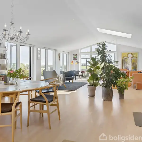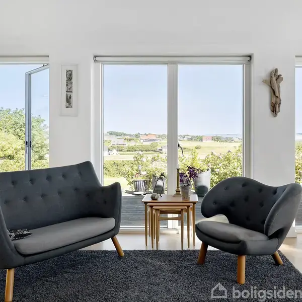 Villaen på 180 kvadratmeter er løbende blevet udbygget og fremstår med nyere tilbygning fra 2010. Her får du en særlig bolig med afvekslende planløsning og panoramavinduer, som rammer et af Thy’s mest betagende udsigtspunkter over Limfjorden, med landsbyen Sennels og Mors som en smuk baggrund. Den store grund på 1.435 kvadratmeter giver ro og plads med flot udsigt til åbne marker, hvor du kan kombinere det landlige med den korte afstand til byens faciliteter. Indretningen er flexibel og rummelig