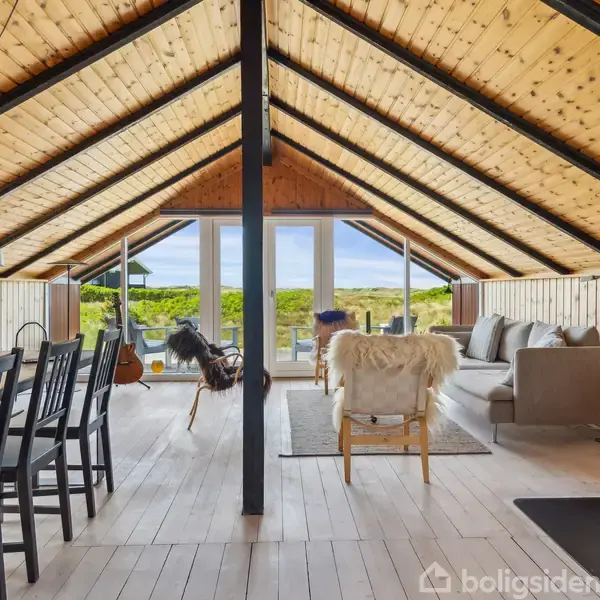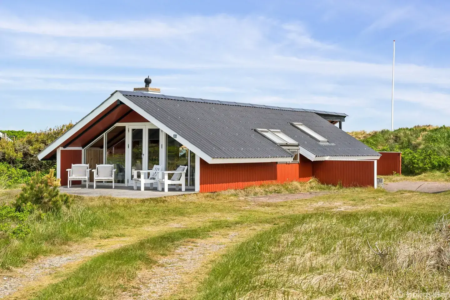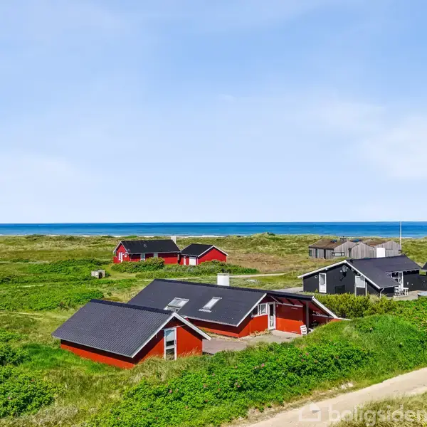 ET ÆGTE FRISTED KUN 150 METER FRA VESTERHAVET · En perle med velbevaret sommerhusstemning · To minutters gang til den brede Rødhus Strand · Store vinduer inviterer naturen helt ind · Fri udsigt til hede, lyng og marehalm · Dejlige terrasser mod solen i øst og vest Man føler sig heldig, hver gang man sætter kurs mod Rødhus Strand for at holde ferie – og man føler sig særligt heldig, når man ankommer til denne perle af et fritidshus, som ligger på et baggrundstæppe af marehalm og klitter kun 150 m