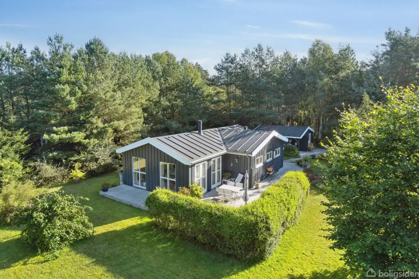 Charmerende fritidshus - flot og velholdtNordøst for Stubbe Sø og cirka 12 km nord for Ebeltoft ligger det skovklædte sommerhusområde, Fuglslev, der har navn efter den nærliggende, lille landsby. På en stikvej i den yderste del af området, ligger dette skønne sommerhus, der er opført i 2009, og som fremstår i rigtig flot og velholdt stand. Huset er yderst charmerende, malet i en mørk gråtonet farve med hvide vinduesrammer med store sprosser og med tagpap med listedækning.Huset er beliggende på e