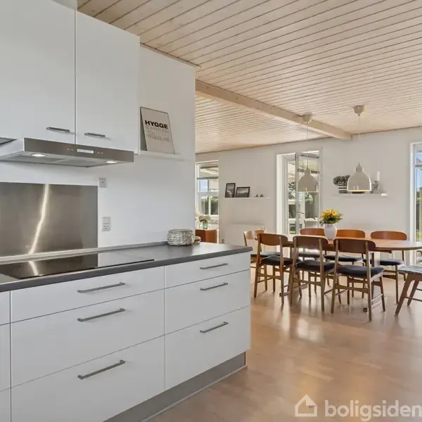 Huset her ligger dejligt placeret for enden af en lukket villavej i den eftertragtede bydel Højene i Hjørring. Rammerne er løbende vedligeholdt, og senest blev det ene badeværelse moderniseret omkring 2022. Indretningen i hjemmet er blandt højdepunkterne, for børnefamilien får en eminent børneafdeling med eget bad og hems på hver af de to værelser. Velkommen til. Kom med indenfor – enten via entréen eller bryggerset, som begge leder videre til det store opholdsmiljø. Her er køkkenet udført i f