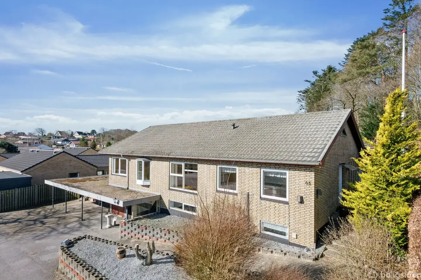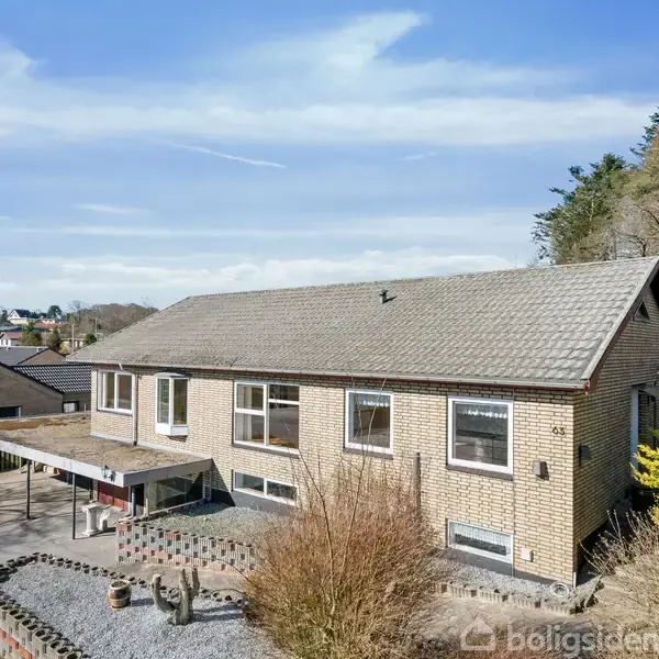 Solid gulstensvilla med decratag, centralt beliggende og alligevel tæt på Hjørring Bjerge, indkøbsmuligheder og skole med idræt m.m. Villaen henvender sig til den store familie, hvor der sættes pris på god plads, idet der er en virkelig god og anvendelig kælder. Boligen er bygget ind i skrånende grund. Fra det store overdækkede areal mod syd-øst, hvor der tillige er carport, går du ind i kælderplan, hvor der er stort forrum/stue, som fordeler kælderens forskellige rum, der er installeret fast bar og rummet har tidligere været brugt som gildesal, der er videre stort depotrum/værksted (tidl. garage 28 kvm) med dør ud til det fri, depotrum, bryggers/vaskerum med toilet og viktualierum, opgang til boligdelen. Går man rundt om boligen øst og nord omkring, er der forgang, mellemgang/opgang med værelsesafdeling med 3 gode værelser, soveværelse med eget badeværelse med bruseniche, gæstetoilet med bruseniche, stor stue med udgang til pejsestue (pejseindsats er pt. ikke i drift), spisekøkken. Der er fra flere af rummene udgange til haven, som indeholder stort terrasseanlæg, overdækning m.m. Der er lille havebassin og ellers er haven omgivet af store træer og buske. Der er lille græsareal. Carport og redskabsrum. Fjernvarme.