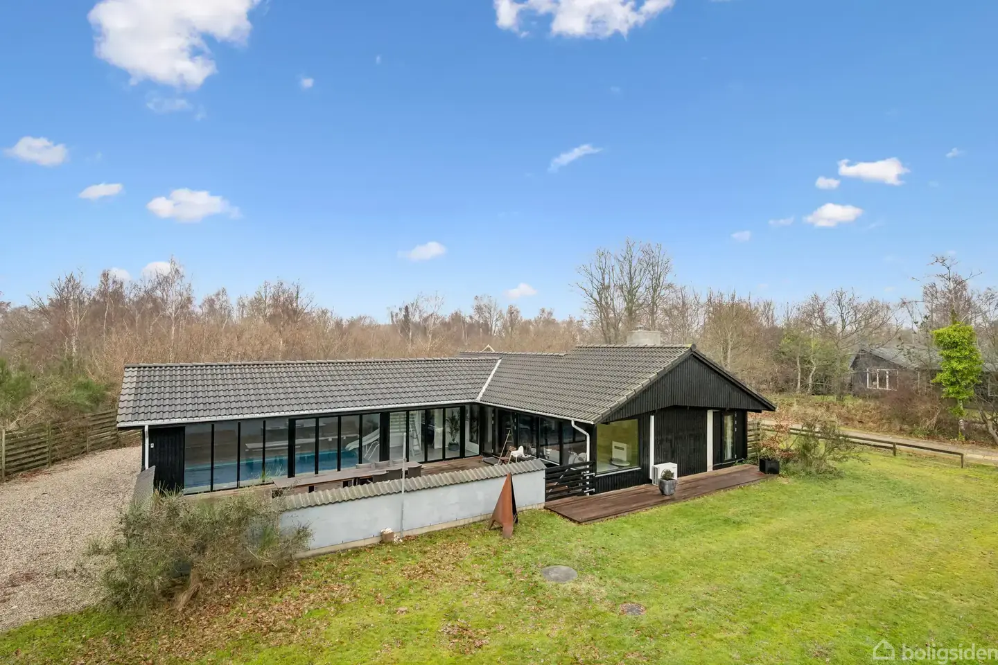 På en plan og regulær grund på 1412 m² ligger dette fritidshus på 137 m², hvor et indendørs poolområde og store glaspartier bryder grænserne mellem inde og ude. På ejendommen kombineres klassisk sommerhusstil med moderne elementer, blandt andet et åbent areal med spiseplads og stue, der er badet i naturligt lys fra de mange vinduer. Huset fremstår indbydende med et tidssvarende udtryk og et layout, der giver plads til både afslapning og samvær. Indretningen byder på 3 værelser, funktionelt køkk