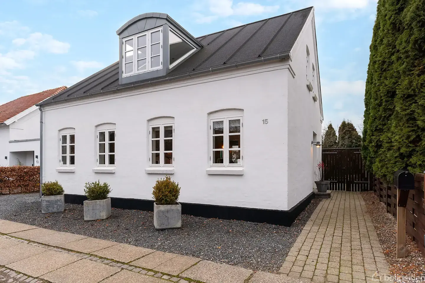 På Skolegade 15 venter en charmerende villa fra 1910, indflytningsklar og fuld af moderne løsninger. De 156 m² fordeler sig over to lyse etager med tre værelser, to badeværelser og et stilrent køkken med brændeovn. Stuen er indbydende, mens den vestvendte gårdhave giver plads til leg, sol og afslapning. Carport og skure fuldender hjemmet, der er klar til både hverdagsliv og hyggestunder.Her venter et hjem, hvor detaljerne gør forskellen. Facaden kombinerer hyggelige gesims og sprossedevinduer me