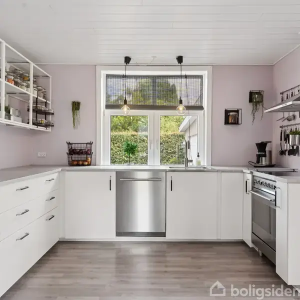 Velkommen til denne skønne 1½-plans villa, hvor hjemlig hygge og moderne bekvemmeligheder går hånd i hånd. Her får du en bolig, der er både indflytningsklar og fuld af muligheder – perfekt til familien, der ønsker god plads og trygge omgivelser.Stueplanen byder på en velindrettet og lys boligoplevelse. Fra den rummelige entré er der adgang til husets hjerte – et flot, stilrent køkken fra 2019, der emmer af kvalitet og funktionalitet. Her er masser af skabsplads og gode arbejdsforhold til madlavn