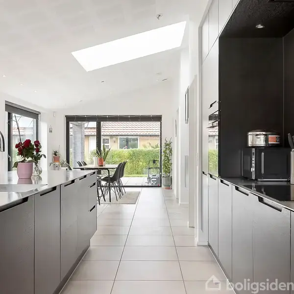 Åbent hus med tilmeldingskrav 2/2 - klik på billede - På én af Tranbjergs mest eftertragtede adresser finder du denne moderne og gennemførte villa fra 2019 – en bolig, der kombinerer gennemtænkt planløsning, stilrene materialer og en beliggenhed tæt på alt, hvad familielivet kræver. Boligen byder på hele 184 m² fordelt på fire gode værelser, to lækre badeværelser, et praktisk bryggers samt et stort og centralt placeret køkken/alrum i åben forbindelse med stuen. Her skaber loft til kip, store vinduespartier og en markant ovenlyskuppel en helt særlig rumfornemmelse, hvor lys og luft får lov at dominere. Køkkenet står i et elegant, mørkt design med integrerede hvidevarer og en stor ø med både arbejdsplads og samlingspunkt for familien. Fra alrummet er der direkte adgang til den overdækkede, sten-anlagte terrasse, der forlænger opholdssæsonen og giver rig mulighed for udeliv uanset vejret. Soveafdelingen rummer et lyst forældresoveværelse med indbyggede skabe samt tre børne-/kontorværelser. Begge badeværelser er udført i moderne stil med lyse klinker, væghængte toiletter og bruseniche. Udenfor venter en stor have med god plads til leg, trampolin og boldspil – samt en rummelig carport på 38 m² med integreret redskabsrum og ladepunkt til elbil. Her får du en bolig, der står knivskarpt – både ude og inde – og som ligger i direkte forbindelse med stisystemer, der fører til skole, daginstitutioner, indkøb og idrætsfaciliteter. Kort sagt: En vidunderlig, indflytningsklar villa på en af Tranbjergs bedste beliggenheder.