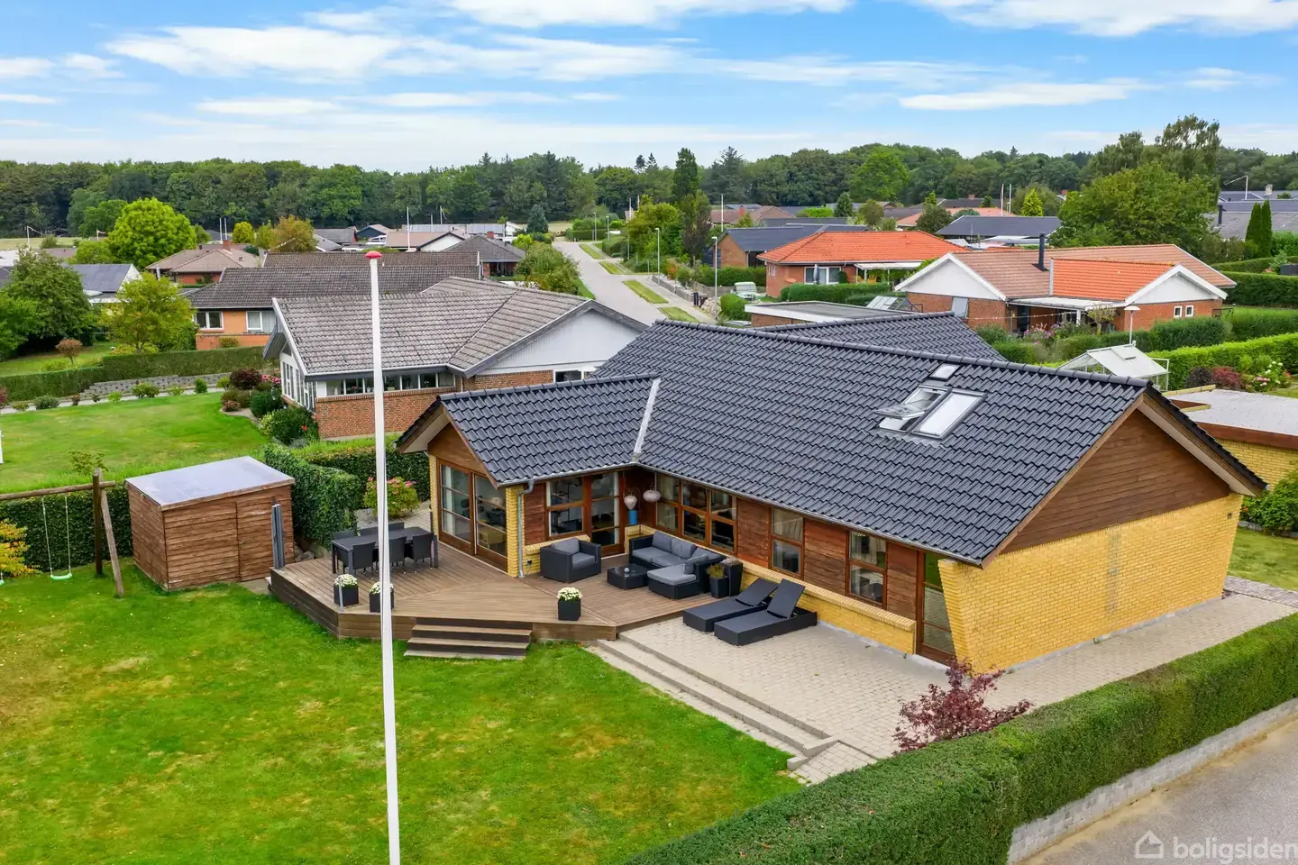 Det er svært at forestille sig mere ideelle rammer for en børnefamilie, end hvad denne flotte og meget gennemførte etplansvilla kan tilbyde. Beliggenheden for enden af et lukket vænge er helt optimal med nem forbindelse til både skole, børnehus, sportshal samt til områdets skove og til dejlige Bøgeskov Strand. Huset er løbende opdateret og forbedret gennem de sidste omkring 20 år og står flot og velholdt såvel inde som ude - velkommen til! Husets arkitektur, hvor de vertikale mure skråner udad,