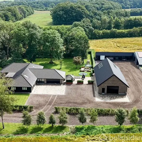 Enestående liebhaverejendom med udviklingspotentiale og parklignende have i Thyregod Midt i den rolige og familievenlige bydel i Thyregod, med indkørsel direkte fra det nyeste parcelhuskvarter, finder man denne helt unikke ejendom, der nu udbydes til salg. Her bor man med kort afstand til alle byens faciliteter – skole, idrætshal, svømmehal og stadion ligger blot fem minutters gang væk, og der er heller ikke langt til Thyregod Station, hvorfra toget kører direkte mod både Herning og Vejle. Samtidig når man motorvejen mod Herning og Vejle på bare fem minutter i bil, hvilket gør ejendommen ideel for pendleren eller den aktive familie. Ejendommen rummer ca. 6,75 ha jord, som ligger samlet omkring bygningerne. Jordarealet er pt. udlejet på årlig basis. Endvidere støder en del af jorden op til et nyt lokalplanlagt område udlagt til boligformål. Det er muligt at tilkøbe netop dette areal, hvis man har interesse i udvikling/udstykning af grunde m.m. Stuehuset der er opført i 2017 og senere tilbygget, fremstår moderne, lyst og særdeles rummeligt med hele 282 m² bolig og direkte adgang til en integreret garage på 56 m². Huset er indrettet med en indbydende entre, hvorfra der er adgang til garagen gennem en elegant New Yorker-dør. Der er flere gode værelser, herunder en separat børneafdeling med to store værelser, mens forældreafdelingen byder på soveværelse med direkte adgang til eget badeværelse og et rummeligt walk-in-closet. Boligens hjerte er det store, åbne køkken/alrum og stue, hvor loft til kip og store vinduespartier giver et skønt lysindfald og udsigt til den imponerende have. Desuden er der et ekstra badeværelse, et rummeligt bryggers med opgang til hems samt yderligere værelser, der skaber mange indretningsmuligheder. Flere solterrasser rundt om ejendommen samt overdækket areal, hvor spa/jacuzzi er installeret og medfølger i handlen. Til ejendommen hører også en stor hal på 220 m², opført i 2021. Hallen er indrettet med troldtektlofter, spots og moderne faciliteter, herunder badeværelse, mindre køkken, teknikrum, værelse og et stort disponibelt rum på førstesalen. Denne bygning åbner for et væld af muligheder – hvad enten det er Airbnb, liberalt erhverv, værksted, lager, kontor eller bare god plads til hobby. Bemærk, at hallen ikke er godkendt til beboelse. Hertil kommer et godt maskinhus på 150 m² fra 1995 med fast bund, ideelt til opbevaring, værksted eller maskinpark. Herudover tilbygning/overdækning til maskiner. Ejendommen opvarmes med en kombination af jordvarme, solceller (20kWh hybridanlæg m 15 kWh batteri) og varmepumper, hvilket sikrer en energieffektiv og fremtidssikret løsning. Haven omkring boligen er i en klasse for sig. Den er anlagt som en stor, parklignende oase med gamle træer, storslåede rhododendronbuske og masser af små kroge og stier, der indbyder til ophold og nydelse året rundt. Her får man en ejendom, der sjældent udbydes – med moderne boligstandard, naturskønne omgivelser og et klart potentiale for udvikling. En oplagt mulighed for den, der ønsker at bo på landet uden at give afkald på byens bekvemmeligheder – eller for investoren med øje for fremtidige muligheder. Ejendommens areal er anslået, da ejendommen er under udstykning.