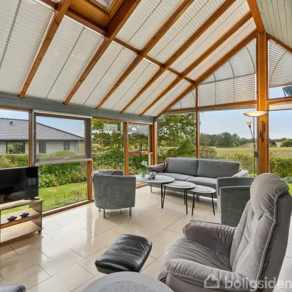 ETPLANSVILLA MED UDSIGT OG LUFT/VAND VARMEPUMPE!  - FANTASTISK HAVESTUE MED GULVVARME OG UDSIGT  Drømmer I om en veldisponeret etplansvilla med stort leverum og plads til hele familien?  Familievillaen byder på en masse moderne løsninger, og der er i den grad fokuseret på kvalitet og velvære. Villaen byder velkommen i den indbydende entré med adgang til fordelingsgangen ned til villaens to værelser (tre kan let etableres igen) og stort badeværelse. Fra fordelingsgangen bliver man budt ind i det