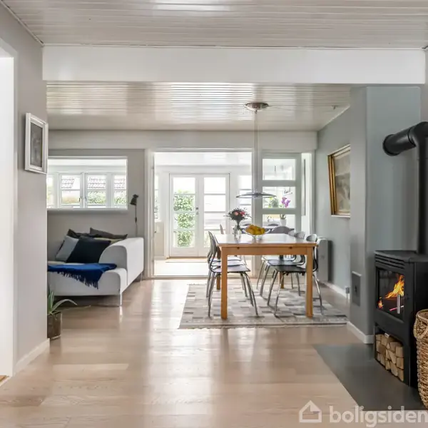 Her er en ro, der ikke føles fjern – bare rigtig.Slåenbækken 6 er et enderækkehus på 114 m² fordelt på 5 rum. Her bor man for enden. Med lidt mere himmel. Lidt mere ro. Indenfor mødes man af en dejlig, åben planløsning, hvor køkken og opholdsrum glider naturligt sammen. Her er ikke små, lukkede rum – men sammenhæng. Man kan lave mad og stadig være med i samtalen. Man kan dække op, mens ilden knitrer i brændeovnen mellem køkken og spiseplads. Det hele hænger sammen på en måde, der giver både luf