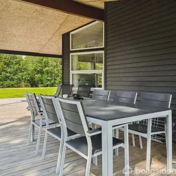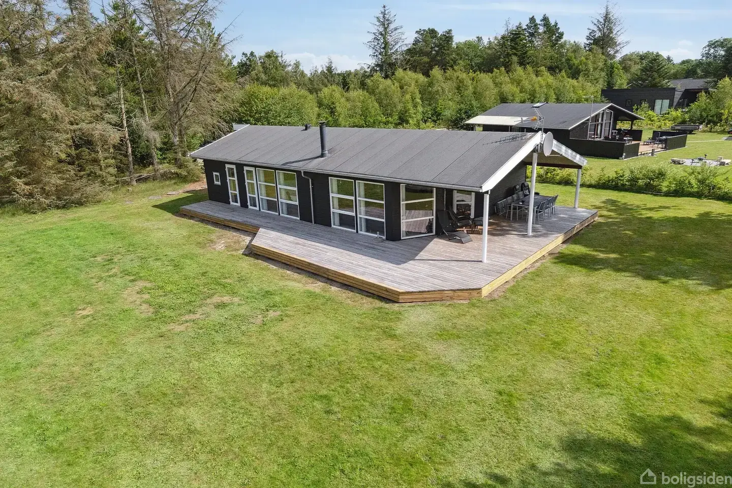 Lyst og indbydende fritidshus med plads til hele familien – tæt på strand, natur og ferieidyl Et skønt fristed med plads til både afslapning, samvær og feriestemning – det er præcis, hvad du får i dette charmerende fritidshus, der forener funktionalitet, komfort og flot arkitektur på bedste vis. Huset byder dig indenfor i en rummelig entré med god plads til overtøjet, inden du træder ind i det imponerende opholdsrum. Her åbner rummet sig helt op til kip, og det flotte trækonstruktion skaber båd
