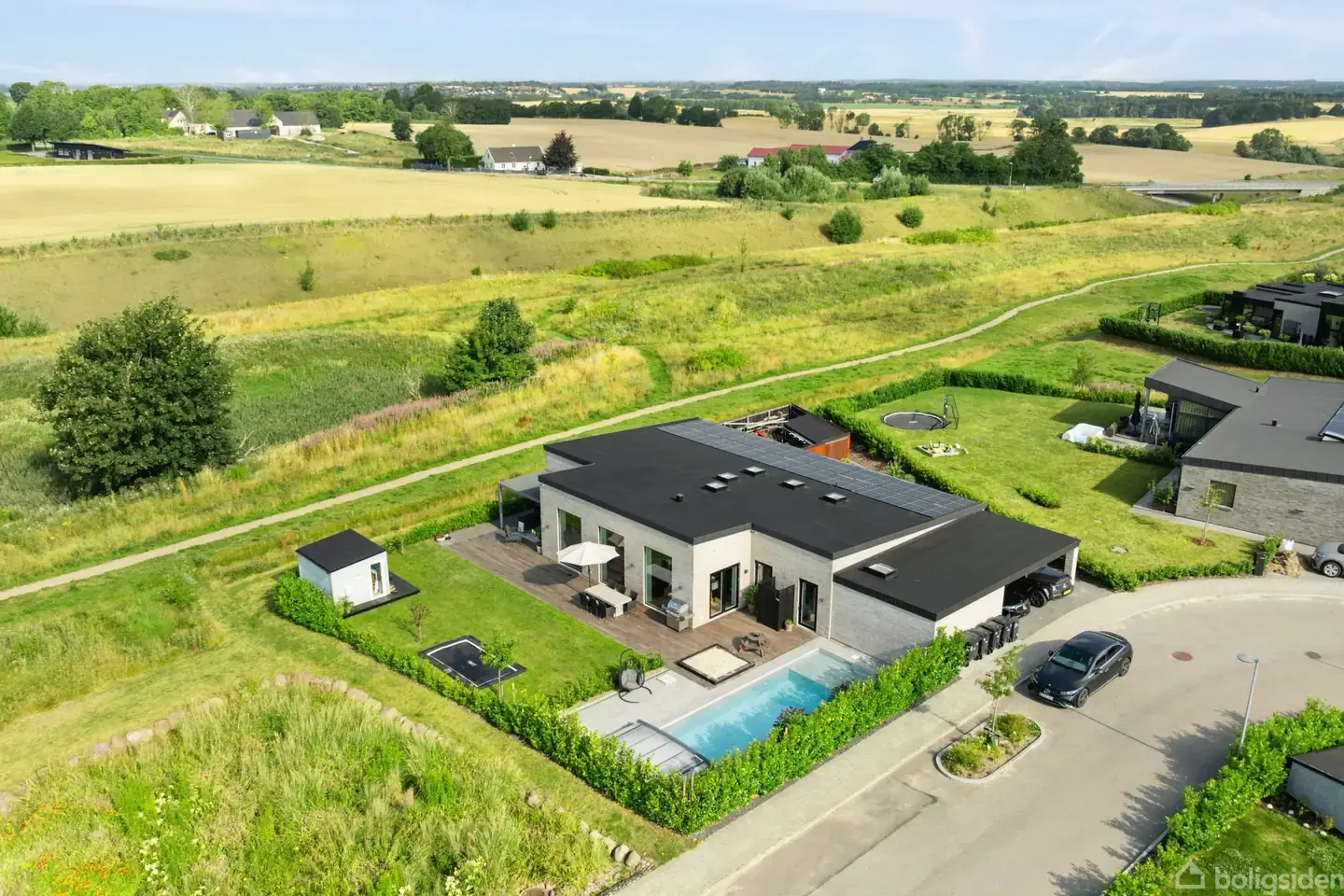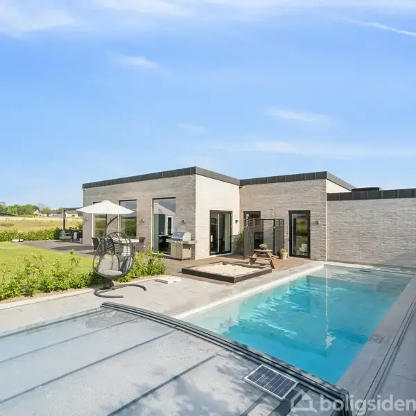 Velkommen til et hjem i særklasse I det attraktive og fredelige område Små Gryde i Smørum finder du denne nyopførte perle af en bolig – et hjem, hvor kompromisløs kvalitet, gennemtænkte løsninger og luksuriøse detaljer går op i en højere enhed. Huset byder på i alt 232 etagemeter, fordelt på 5 værelser, der alle er indrettet med fokus på både æstetik og funktion. Flere af værelserne har direkte adgang til terrasse- og poolområdet, mens forældresoveværelset imponerer med eget walk-in-closet og