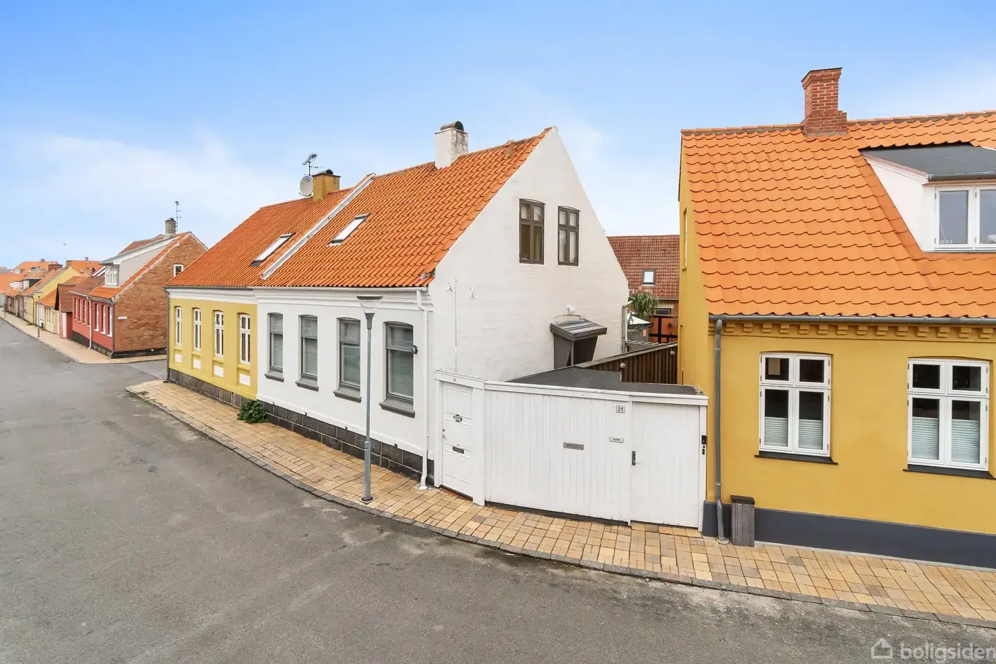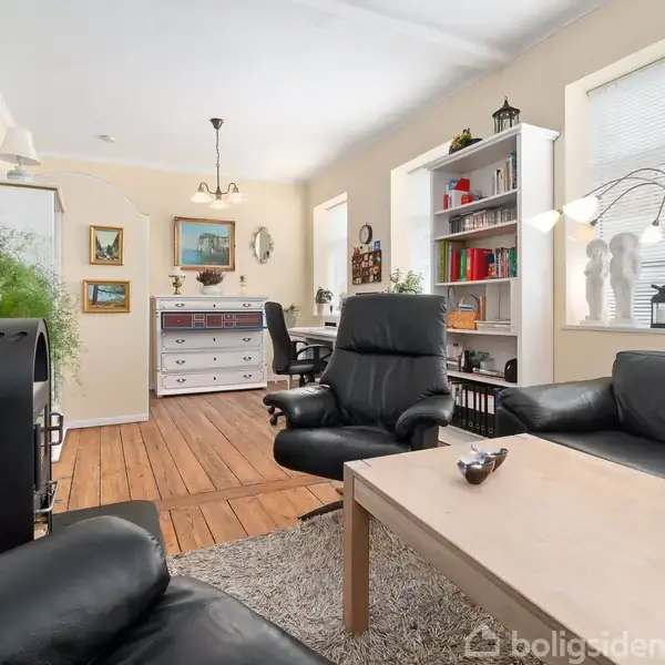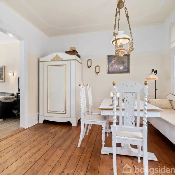 Halvt dobbelthus central i RønneDu ankommer til en charmerende bolig med hvid facade og et rødt tegltag, der er fra 1999.Indenfor er det de massive, oliebehandlede trægulve, som bidrager til den sjælfulde atmosfære, du kan se frem til i de to sammenhængende stuer.I den største af stuerne giver de sydvendte vinduer masser af lys, og fra den anden stue er der direkte adgang til køkkenet. Sidstnævnte har et klassisk udtryk og er videre forbundet til udestuen, som gør forår og efterår ekstra skønne.