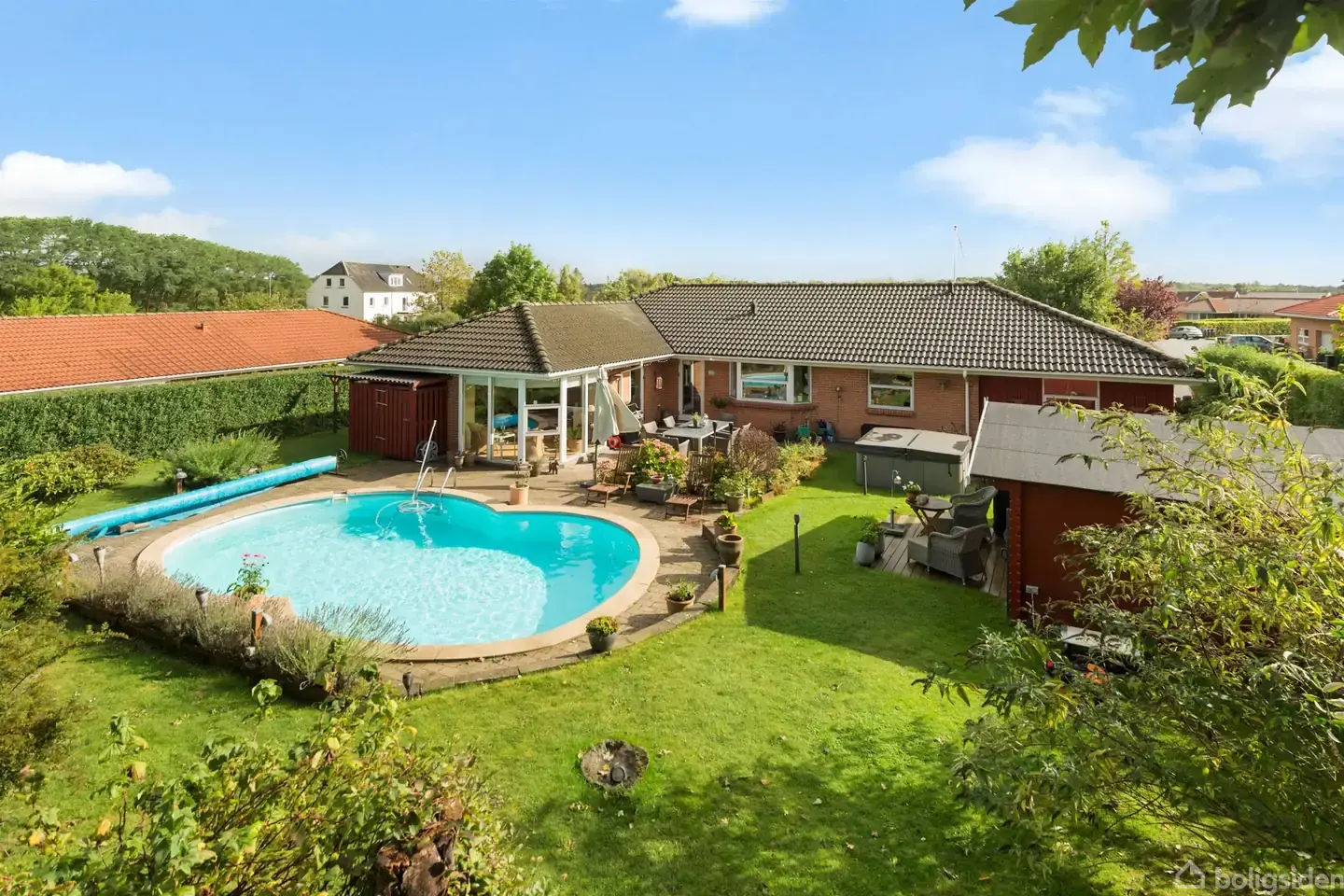 Åbent hus med tilmeldingskrav 2/2 - klik på billede - I Vrold finder du denne indbydende villa fra 1998, som rummer alt, hvad familien kan ønske sig. Boligen byder på en gennemtænkt planløsning med fire værelser og to badeværelser, hvilket giver god plads til både børn og voksne. Hjemmets naturlige samlingspunkt er det store køkken/alrum i åben forbindelse med stuen, hvor store vinduespartier sikrer et dejligt lysindfald og skaber en harmonisk forbindelse til haven. Forældresoveværelset er indrettet med eget badeværelse, mens de tre børneværelser deles om husets andet badeværelse – begge holdt i tidløst design med bruseniche. Derudover byder villaen på et praktisk bryggers med egen indgang samt integreret carport med tilhørende skur, der giver plads til opbevaring af alt fra cykler til haveredskaber. Haven er anlagt med fokus på både hygge og oplevelser. Her kan sommerdagene tilbringes ved den store pool, som danner rammen om både afslapning og leg, mens terrasserne giver oplagte rammer for grillmiddage og hyggestunder med familie og venner. Beliggenheden er ideel med kort afstand til motorvejsnettet, så både Aarhus og Horsens kan nås på under en halv time i bil. Skanderborg midtby findes blot 15 minutter væk på cykel og byder på et varieret udvalg af butikker, caféer, spisesteder, kulturtilbud og smukke naturoplevelser. I nærområdet er der grønne områder, der indbyder til gåture, ligesom offentlig transport er lettilgængelig i kort afstand fra ejendommen. Tjek Boliglån https://www.raadtilpenge.dk/Gode-raad/boliglaan/landingsside