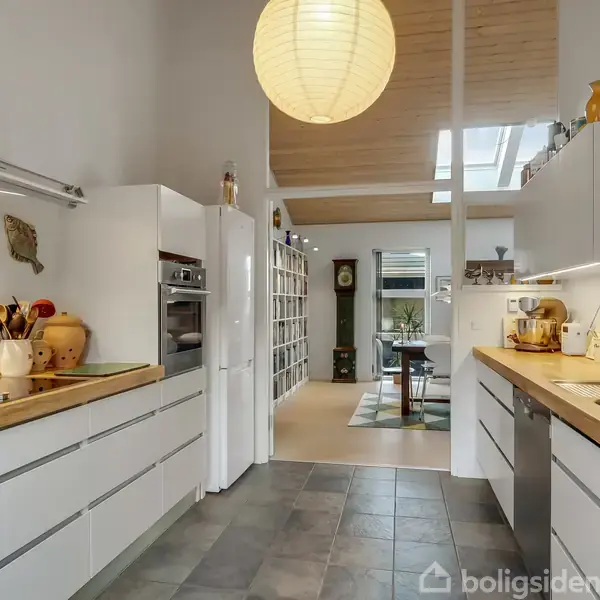 Wauv, hvor ville det være skønt at bo i dette dejlige hus, hvor der er gennemtænkt energirigtige løsninger, mindst mulig vedligeholdelse og mest mulig tid og socialt samvær med familie og venner. Her er skønne store værelser til ”store og små”, alt er topmoderne og i en særdeles smagfuld stil. Overalt vandskurede vægge i det dobbeltmurede hus, lofter til kip med Velux ovenlysvinduer. Smukke klinke- og parketgulve i ask og Invita skabselementer. Fra træterrasse (Douglasfyr) vidunderlig udsigt ove
