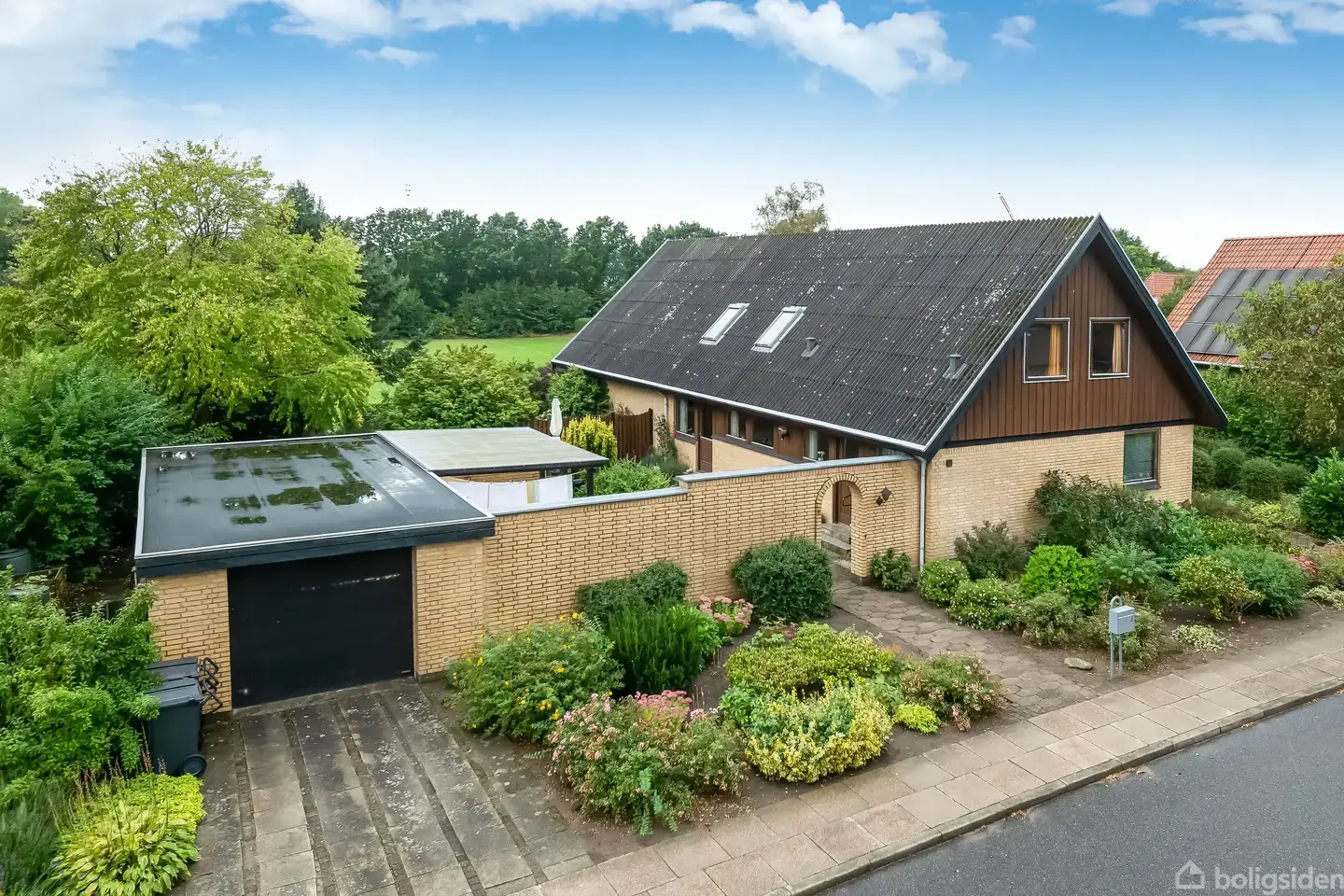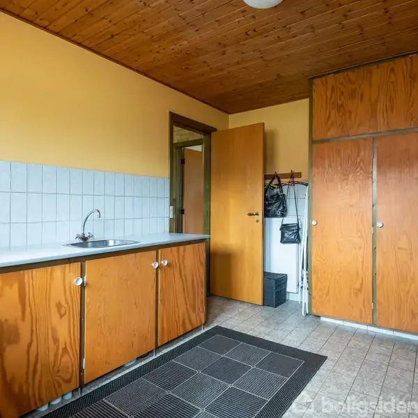 Søbakken 8 er en rummelig bolig på hele 265 m² med 5 værelser, beliggende tæt på både skole og indkøb. Bag haven ligger et stisystem, der gør det nemt og sikkert at komme rundt til hverdagens gøremål. Indenfor mødes man af et stort og praktisk bryggers med plads til både vaskemaskine, opbevaring, bordplade med vask samt klinker på gulv og væg. Ved siden af bryggerset findes et lille viktualierum. Huset rummer to badeværelser – ét i stueplan med blå fliser, hvid sanitet og bruser, samt ét på 1. s