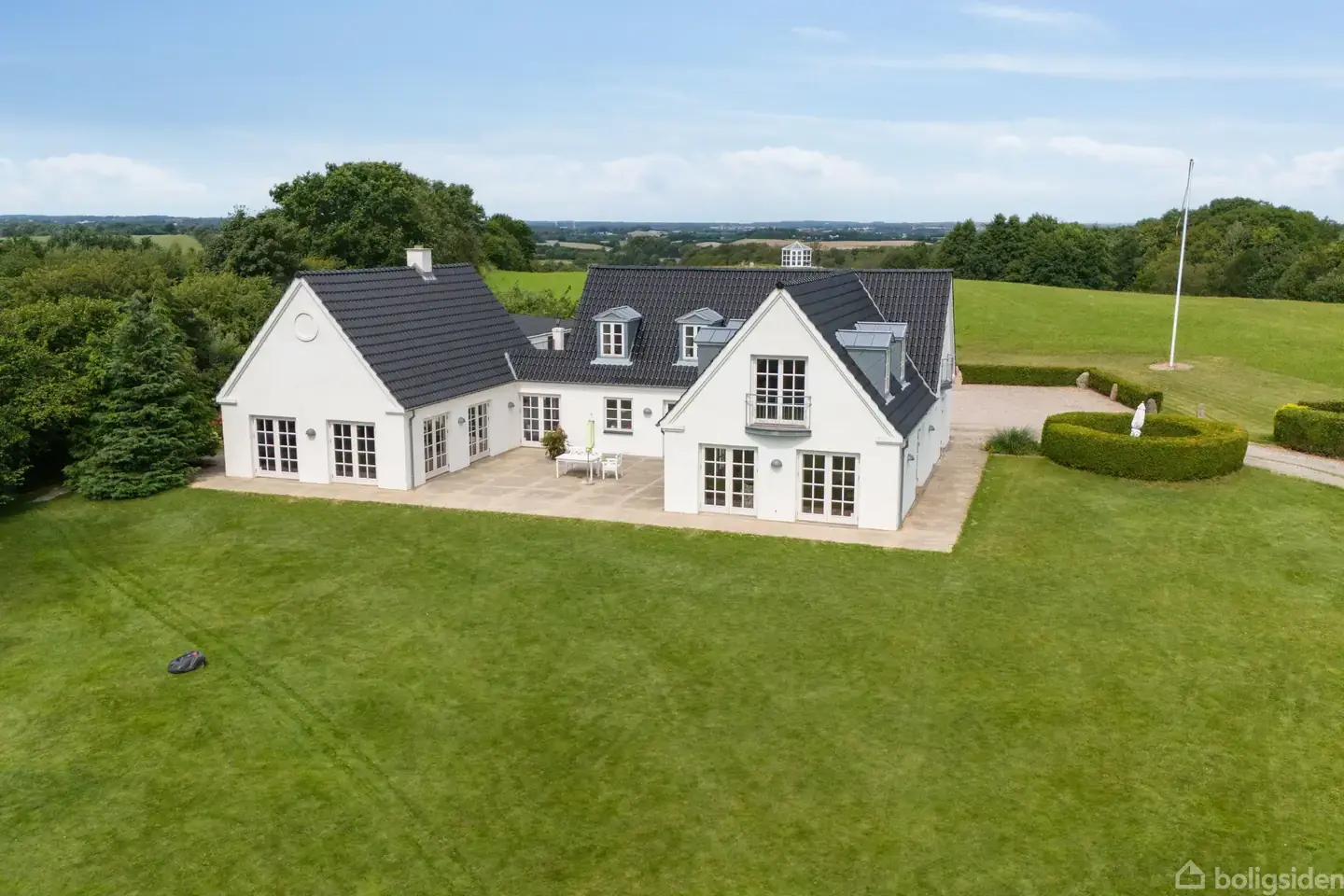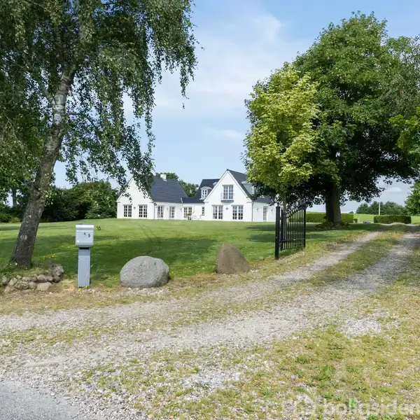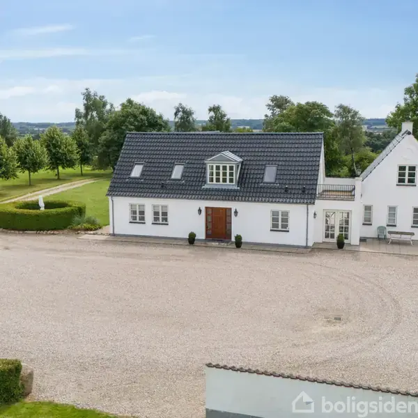 Allerede ved ankomsten til denne unikke villa fornemmes det harmoniske samspil mellem kvalitet, beliggenhed og ikke mindst den betagende udsigt. Den herskabelige indkørsel, der flankeres af smukke, opvoksede træer, leder op til et indbydende gårdmiljø, hvor roen sænker sig, og hvor de grønne vidder i det kuperede landskab åbner sig for alle sanser. Her er rammerne skabt om et eksklusivt hjem midt i naturen, hvor moderne komfort og arkitektonisk elegance smelter naturligt sammen med omgivelserne.
