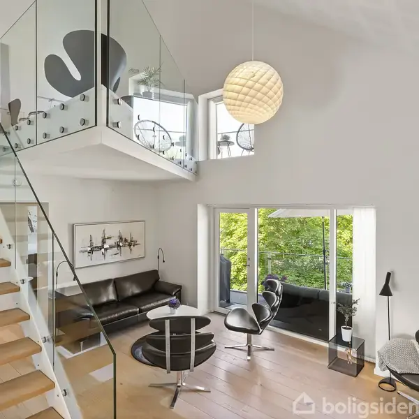 Udsigten over Søbyen, Lillesø og skoven er i særklasse fra denne eksklusive penthouselejlighed, der breder sig over både fjerde og femte sal i hjertet af Skanderborg. Det er den eneste lejlighed i hele Søbyen med hele fire altaner – og med kvalitetsmaterialer, gennemført indretning og "egen p-plads" med ellader får I her noget helt særligt.Elevatoren bringer jer op til et hjem med op til seks meter til loftet og tværgående lysindfald, der tilsammen skaber en enestående rumfornemmelse. I stuen, s