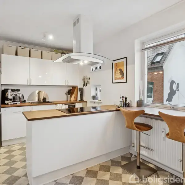 Træd ind i lejligheden på førstesalen, i ejendommen som er fra 1948, hvor stuk og rosetter giver karakter og sjæl til hjemmet. Planløsningen er gennemtænkt: entré med adgang til badeværelse, et roligt soveværelse med plads til skabsopbevaring og en indbydende stue i åben forbindelse med køkkenet. De 65 m² er udnyttet, så hjemmet føles rummeligt, funktionelt og nemt at indrette.Fra køkkenets vindue breder byen sig for dine fødder med kig helt til Silkeborg Langsø. Åbn døren til den store altan, o