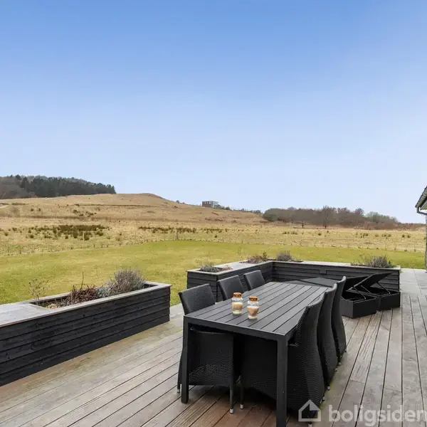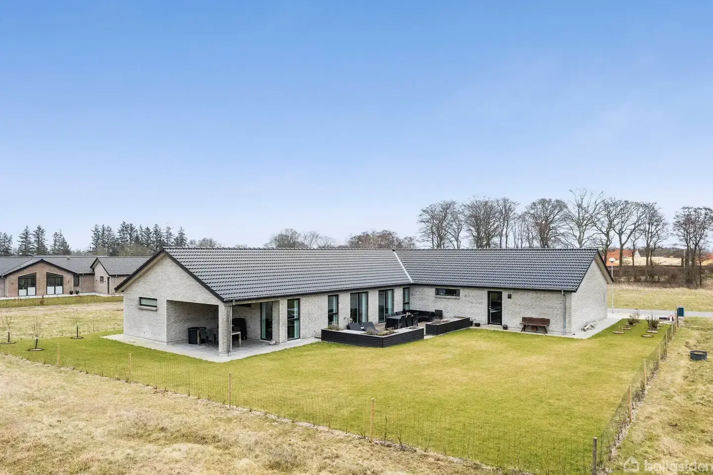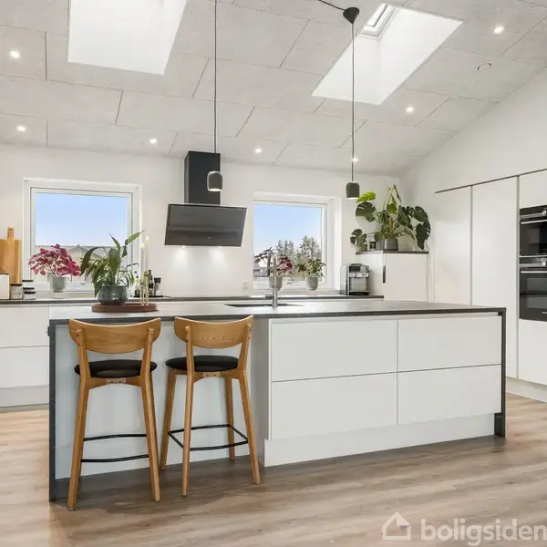 Er I til nybyggeri, men ønsker at undgå den ofte lange, opslidende og til tider besværlige proces med byggetilladelser, materialevalg, risiko for budgetoverskridelser, indretningsbeslutninger og meget mere, får I her muligheden for at overtage en skøn, vinkelbygget villa fra 2023 – helt uden ventetid. Søhusene 38 ligger i den vestlige del af Frederikshavn, omgivet af naturskønne arealer. Her kan du nyde en betagende udsigt både inde og ude mod det kuperede terræn og den markante bakkeskrænt, hvor landskabet åbner sig mod nord og nordøst i retning af det åbne land og kysten. Boligen rummer 191 m² velindrettet beboelse og en muret dobbeltgarage på 90 m² med gulvvarme, to elektriske Crawford-porte, troldtektloft og direkte udgang til terrassen. Komforten er i top med gulvvarme i hele huset og ventilationsanlæg med varmegenvinding, som skaber et sundt og behageligt indeklima. Opvarmningen sker via varmepumpe til jordvarme, og huset er særdeles velisoleret og energimærket er således i kategori A2015 – en sand energirigtig bolig, der holder driftsudgifterne på et minimum. Materialevalget er gennemført - med troldtektlofter overalt og samme flotte vinylgulv med korkunderlag går igen i alle opholdsrum, mens bryggers og begge badeværelser er udført med ens klinkegulve. Med murede gavle og træ/alu-vinduer fra Rationel er der udvendigt lagt vægt på minimal bygnings vedligeholdelse. Og med den 977 m² store grund primært udlagt i græs og flisebelægning kræver den heller ikke den store opmærksomhed. Indgangen foregår via et overdækket indgangsparti med adgang til både garage og det kombinerede entré- og bryggersrum. Her er der Svane-inventar, bord med vask, klinkegulv og ergonomisk placeret vaskemaskine og tørretumbler. Fra bryggerset er der direkte adgang til den rummelige garage## Køkken-alrummet er indrettet med et stilrent og tidløst Svanekøkken med hvide, grebsfrie låger. Bag en højskabslåge gemmer sig et praktisk viktualierum med god opbevaringsplads. En charmerende, muret alkove skaber et hyggeligt element i rummet – til glæde for både børn og voksne. To dobbelte terrassedøre åbner ud til den sydvestvendte hårdttræsterrasse, hvor udsigten til naturens kuperede terræn kan nydes i fulde drag. Loftet er ført til kip, og to elektriske, appstyrede ovenlysvinduer giver et fantastisk lysindfald, særligt over køkkenøen. Opholdsstuen har også loft til kip og direkte adgang til den overdækkede terrasse, hvor naturoplevelsen fortsætter. Forældresoveværelset rummer både walk-in-closet og eget badeværelse med bruseniche med to brusere, indmuret sæbyhylde, væghængt toilet og Svane-inventar. Derudover findes et ekstra værelse, som kan anvendes som børneværelse, kontor eller gæsteværelse. En separat børne-/ungeafdeling byder på to værelser med skabe samt et badeværelse med bruseniche, indmuret sæbyhylde, væghængt toilet og Svane-inventar.