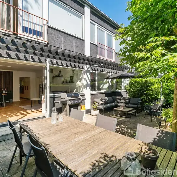 Åbent hus med tilmeldingskrav 8/2 - klik på billede - I grønne, stille og smukke omgivelser udbydes en særdeles flot renoveret stuelejlighed med egen terrasse, som fremstår fuldkommen klar til næste ejer, uanset om I er en børnefamilie eller et par med stort pladsbehov til hjemmekontor og gæster. Boligen er blevet gennemgribende renoveret i 2022 og med den sidste finish i 2023, så I kan se frem til en strømlinet og lys indretning med en rød tråd igennem alle de valgte løsninger. Her er installeret gulvvarme i hele lejligheden, og gulvene er ensartede og dejligt slidstærke, så de kan tåle at blive brugt og klare at der er lidt under sålerne, når man går ud og ind mellem terrasse og stue i årets lune og varme måneder, hvor I kan have terrassedøren stående åben og lade inde og ude smelte sammen. Det store nye køkken er der ligeledes gjort mange gode tanker omkring. Køkkenet er bla. udstyret med hele to indbygningsovne, induktions kogeplade med indbygget emfang og opvaskemaskine. Køkkenmodulerne er fra IKEA og eftermonteret med snedkererede fronter fra Form Plus, det samme gør sig gældende på badeværelset der ligesom resten af lejligheden er total renoveret. Væggene er blevet spartlet, isoleringen er bragt op til standard og alle ledninger er gemt væk, så det hele spiller og står snorlige. I kan også se frem til akustikplader på flere af væggene, som medvirker til at skabe et behageligt lydklima i boligen, udover at de har en dekorativ effekt. Planløsningen er velegnet til en familie med et barn eller to, da her er tre værelser udover stuen og køkkenalrummet. I får også en lækker walk-in garderobe og et temmelig stort badeværelse, hvor det hele er nyt med kæmpefliser i størrelse 80x80 centimeter. Terrassen er placeret godt i forhold til solens gang på himlen, da den vender sydvest og dermed har sollys det meste af dagen og lige indtil solnedgang. Der er ligeledes mulighed for at opleve morgensolens første stråler på den anden side ved køkkenvinduet og hoveddøren. Lejligheden rummer også opvaskemaskine og tørretumbler