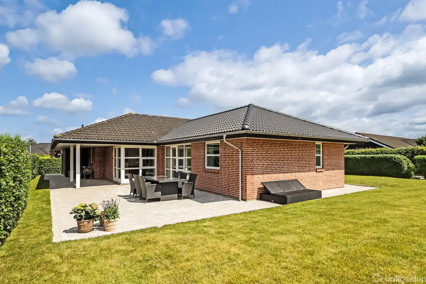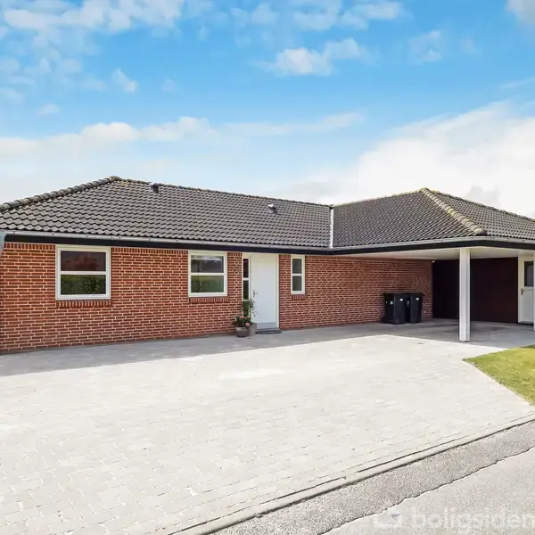 Sydfyn / Ollerup - Kvalitetspræget villa i skønt kvarter På et af Ollerups mest attraktive vænger finder man denne flotte SISA 2000 villa fra 2005, opført med gulvvarme og i generelt tidløse materialer. Huset står i en pæn, rød mursten, her er tænkt på minimal vedligehold ved opførslen og med haven vendt mod syd og vest, kan solen således nydes i fulde drag. Man bydes velkommen i entréen, hvorfra man har adgang til både bryggers og badeværelse. Herfra går man videre ind i husets hjerte - det s