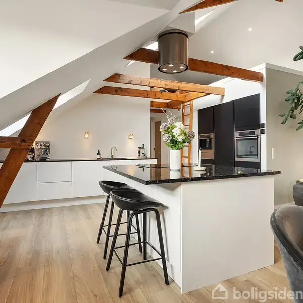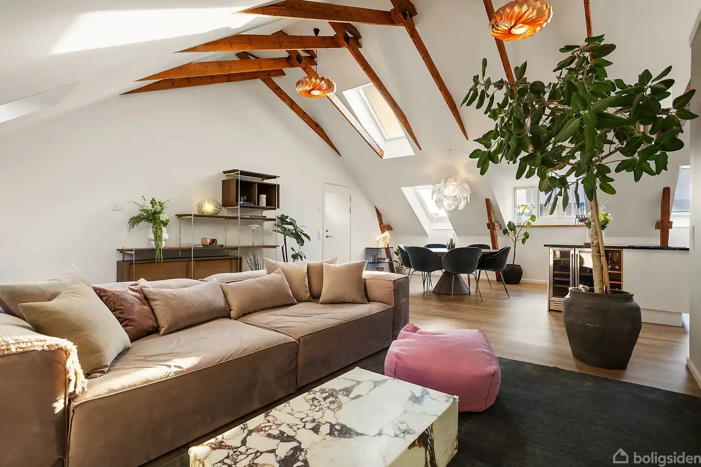 Midt i smørhullet af Aarhus C, hvor byens puls, kultur og hverdagsliv smelter sammen, ligger denne stemningsfulde lejlighed øverst i ejendommen på Sønder Allé. Her bor du centralt – men alligevel tilbagetrukket – i en bolig, der kombinerer arkitektonisk karakter, moderne komfort og en sjælden ro midt i byen.Man bydes velkommen i entréen med plads til overtøj og opbevaring, og allerede her fornemmes boligens gennemtænkte planløsning. Herfra åbner hjemmet sig mod det imponerende køkken-alrum, som