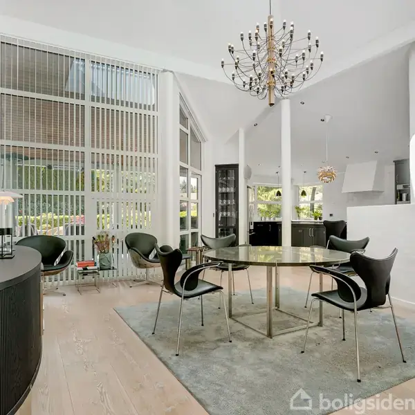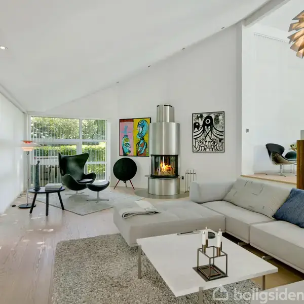 Træernes gamle brede kroner og de store, tætte evigt grønne buske beskytter huset mod både lyd og indkig. Helt skjult, og alligevel helt tæt på Strandvejen i Vedbæk, ligger parkhaven på 2000 m2, der elegant er anlagt og indrettet med skulpturer af danske billedhuggere. Beplantningen er så støjisolerende tæt, at man slet ikke kan høre hverdagens myldretidstrafik, ja, ikke engang et udrykningskøretøj. Vi er også i den gamle stille del af Vedbæk, nord for havnen, hvor husene gemmer sig bag det grønne, og er placeret tilbagetrukket med ryggen til vejen, og fronten forventningsfuldt vendt mod vandet. Med tre gode naboer deles man venligt og fredeligt om en fælles privat badebro med privat strandret. Broen nås gennem en hemmelig overdækket sti fra haven mod den aflåste trædør. Derfra er der blot 100 meter ad en lukket privat vej ned til Øresunds blide bølger, og badebroen på stranden. Oplagt til en lille picnic eller et glas bobler ved vandkanten. Huset på 421 etagemeter, hvor de 149 m2 befinder sig i det høje lyse kælderplan, er bygget i 2000 på en 2000 m2 grund. Det er gennemrenoveret for 4 år siden med dansk arkitektonisk enkelhed og materialer i højeste kvalitet. Helt klar til indflytning. Her er så lyst overalt. I det solbeskinnede center af huset kigger man op mod himmelen, og derfra når man både stuerne, det temperaturstyrede vinrum og den rummelige vinkælder, spa, soveafdelinger og teenage-afsnit. Ude er der terrasser, der fanger solen på ethvert tidspunkt af dagen, og den, der er vendt mod aftensolen, er naturligvis opvarmet og har udendørs ildsted. Her i udkanten af Vedbæk, næsten på vej til Rungsted, er livet i begge retninger smukt, og fuld af kultur, natur og lækre restauranter. Skulle hovedstaden alligevel friste, er der blot en halv time til Kgs. Nytorv.