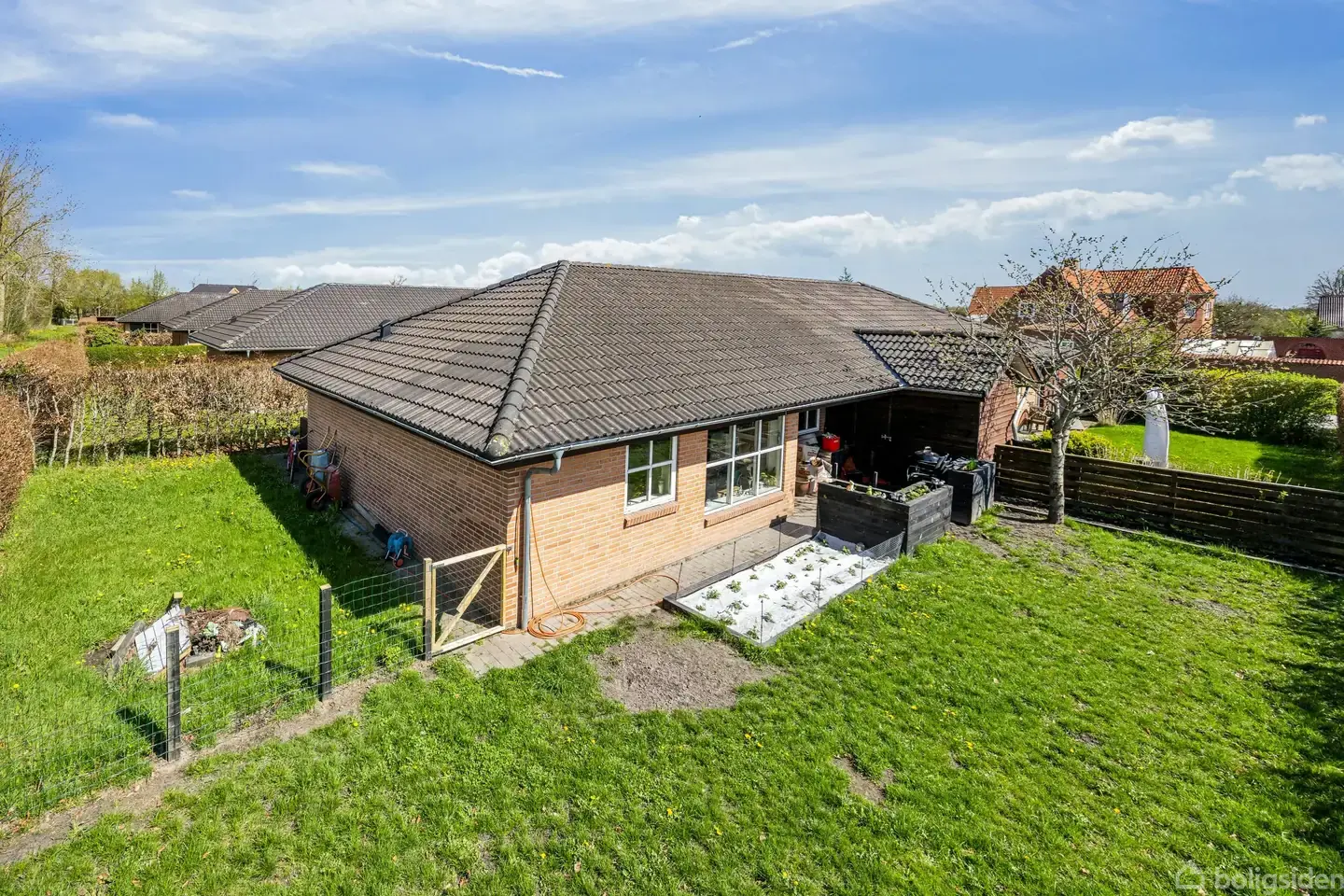 Rækkehus i ét plan med hyggelig og solrig have