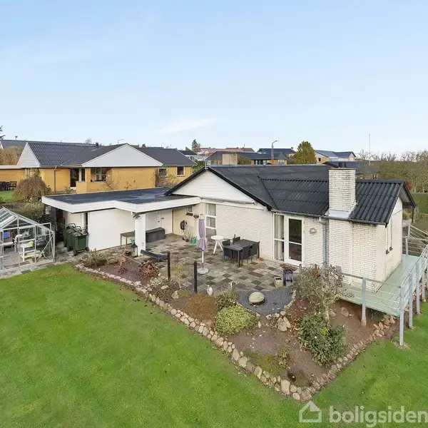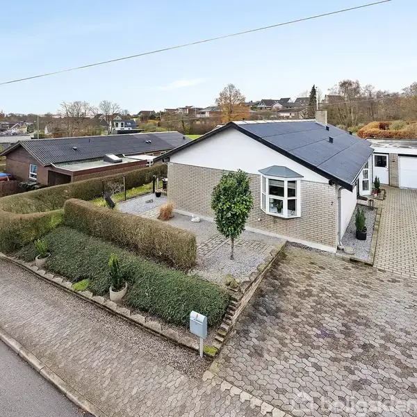 På Solbakken 7 finder I en bolig, hvor hverdagen får ro og plads til at folde sig ud. Beliggende på en lukket og fredelig villavej er rammerne ideelle for familien, der drømmer om trygge omgivelser og korte afstande til både skoleliv, fritidsaktiviteter og offentlig transport. Villaen byder på 126 velindrettede kvadratmeter, hvor funktionalitet og atmosfære går hånd i hånd. Her er tale om en bolig, der er klar til at blive taget i brug fra dag ét, med lyse rum og en indretning, der naturligt samler familien. Boligens opholdsarealer er husets hjerte. Køkkenet er holdt i et tidssvarende udtryk og ligger i naturlig forlængelse af spisestuen, hvor dagslyset strømmer ind. Den sænkede stue skaber en hyggelig kontrast og indbyder til afslapning – særligt på kølige dage, hvor brændeovnen tilfører ekstra varme og stemning. Planløsningen rummer desuden et rummeligt soveværelse, to gode børneværelser samt et flot moderniseret badeværelse. Bryggerset fungerer som en praktisk overgang fra garage til bolig og gør hverdagen nem og funktionel. Udenfor venter en dejlig have med flere opholdszoner, der giver mulighed for at følge solen fra morgen til aften. Haven er ideel til både leg, afslapning og hyggelige stunder på terrassen, mens græsplænen indbyder til udeliv for både store og små. Drivhus og garage fuldender de udvendige rammer. Beliggenheden i Ugelbølle kombinerer landsbyens ro med nærheden til Rønde, hvor indkøb, skole og øvrige faciliteter findes få minutter væk. Området er kendt for sit lave trafikniveau og stærke naboskab – et sted, hvor man hurtigt føler sig hjemme.