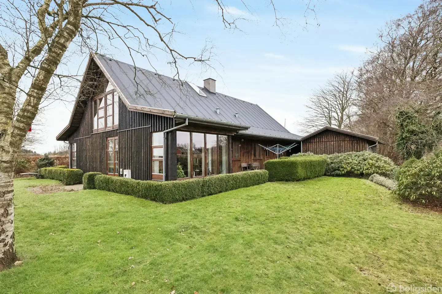 Dette er en ejendom for jer, der ønsker at leve sammen med naturen. I et hus, der er opført i 2005 af delvist bæredygtige materialer, hvor I har udsigt til vidtstrakte marker fra stue og køkkenbord. Udenfor får I en hyggelig have med æbletræer, og beliggenheden er i landsbyen Fly – kun syv minutter i bil fra bylivet i Skive. “Natur” er som sagt nøgleordet for dette hjem. Ydervæggene er af træ, hvilket giver et behageligt og organisk udtryk, og huset ligger i første række til enge og marker med