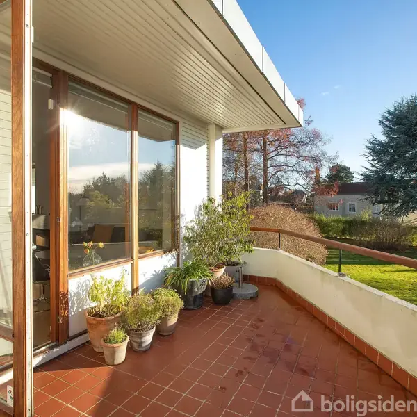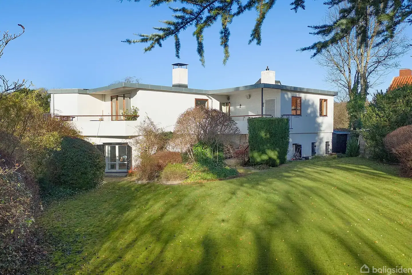 På Soløsevej, i et af områdets mest eftertragtede og naturskønne kvarterer, ligger dette arkitekttegnede dobbelthus med en særligt interessant historie. Huset, tegnet af Jens Houmøller Klemmensen og opført i 1950, hviler på fundamentet af en tidligere bygning fra Jægersborgs gamle forsvarsanlæg. Det giver boligen et udtryk og en karakter, man sjældent møder – en kombination af funktionalistisk arkitektur og historiske lag. Boligen ligger uforstyrret på en højt placeret grund, hvor haven folder sig ud som en lille vedligeholdelsesvenlig park med sjældne træsorter, rododendron og smukke udsigtslommer. Herfra og fra boligens altaner har man et flot kig ud over Hundesømosen og de grønne omgivelser. Et fredfyldt miljø tæt på Ermelundens skovstier og Dyrehavens vider. Bellevue Strand er blot en kort cykeltur væk. Allerede i husets indgangsparti fornemmes arkitekturen. Den femkantede hall med skakternet gulv og svungen trappe er både iøjnefaldende og indbydende. På første sal ligger tre store, lyse værelser, hvoraf det ene har egen altan med direkte adgang til haven – en detalje, der giver en særlig fornemmelse af luft, lys og nærhed til naturen. I boligens hjerte finder du et rummeligt køkken-alrum med Multiform-elementer og Corian-bordplade. Den buede S-formede væg tilfører rummet et kunstnerisk strejf og skaber en naturlig flow-fornemmelse. I forlængelse heraf ligger en hyggelig stue med brændeovn og store glaspartier mod vest, hvor lyset strømmer ind, og udsigten til haven og mosen kan nydes fra altanen. Badeværelset fremstår moderne og stilrent med kvalitetsmaterialer fra Duravit, AJ-armaturer og nyt terrazzogulv. Underetagen giver boligen en ekstra dimension med sine mange anvendelsesmuligheder. Her finder du både vaskerum, fyrrum, gæstetoilet, bad og fem disponible rum, som kan formes efter behov. Det største rum (ikke godkendt) har egen udgang til haven og terrasse, hvilket gør det ideelt som privat afdeling til teenager, gæst eller au pair – eller til hjemmearbejdspladsen, hvor ro og adskillelse er vigtigt. I haven ligger en skøn sydvestvendt terrasse, delvist overdækket af altanen ovenfor. Med lidt lys og en varmelampe er det et perfekt sted til afslapning fra de første forårsdage til de sene sommeraftener.