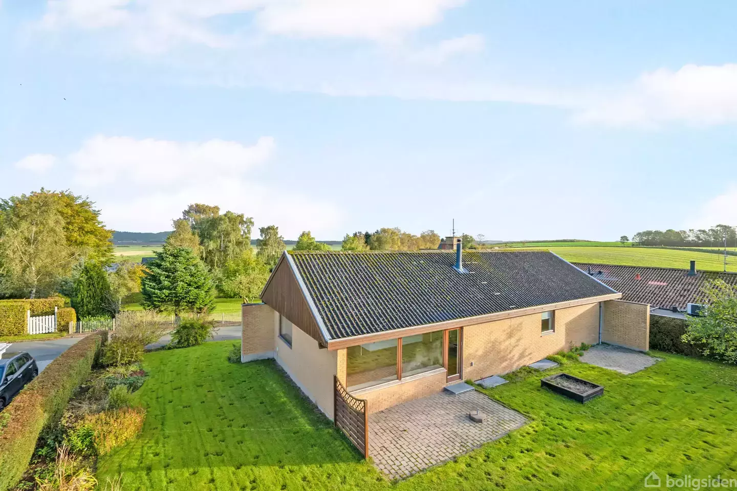 Flot toplans villa med rigtig god planløsning. Det perfekte match for familien med børn eller hvis man har behov for god plads såvel ude som inde. 132 m2 bolig og 96 m2 god kælder. Heraf 30 m2 indbygget garage. Boligen er indrettet med entré med skabe, fordelergang og stort praktisk spisekøkken fra 1991 med HTH elementer, alt i hårde hvidevarer og direkte adgang til vinkelstue. Fra stuen er der udgang til terrasse og kig til natur og flot udsigt, desuden velplaceret Morsø brændeovn. Derudover so