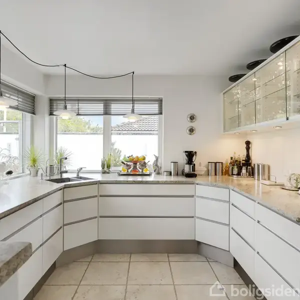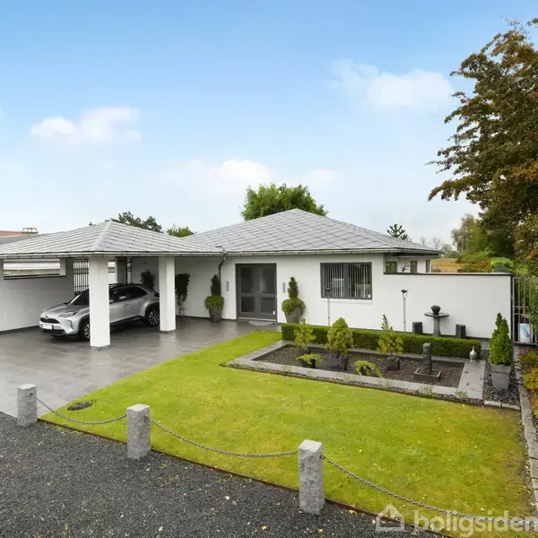 155 kvm fuldmuret vinkelhus med pragtfuld udsigt Beliggende i smukke omgivelser - lige over for Greve Marina og med ugeneret udsigt til smukke engarealer med græssende køer som nærmeste genbo, udbydes denne velbyggede ejendom fra 2001. Overalt fremstår ejendommen velplejet med virkelig smukt ankomstparti med integreret dobbelt carport og velanlagt grundareal med flere udsigtsterrasser. Den store og indbydende entré byder velkommen og straks fornemmer man den lige linje igennem huset med naturen