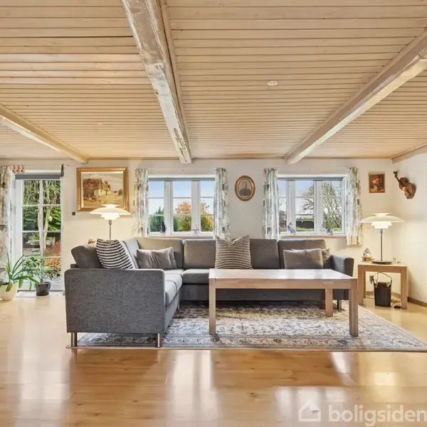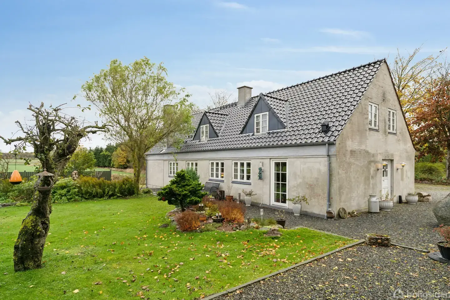 Spørring Møllevej 1 – Landlig idyl med udsigt til markerDrømmer I om fredelige omgivelser, god plads og en bolig, der forener charme med moderne komfort? Så er denne 202 m² store villa i Trige et oplagt valg. Ejendommen ligger tilbagetrukket på en stille sidevej til Randersvej, hvor udsigten til markerne og den smukke natur straks sætter stemningen.Villaen er opført i 1852 og fremstår klassisk med vandskuret facade, sprossede vinduer, hvide rammer og et stilfuldt sort tegltag – en kombination, d