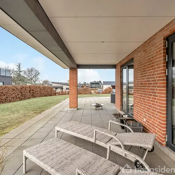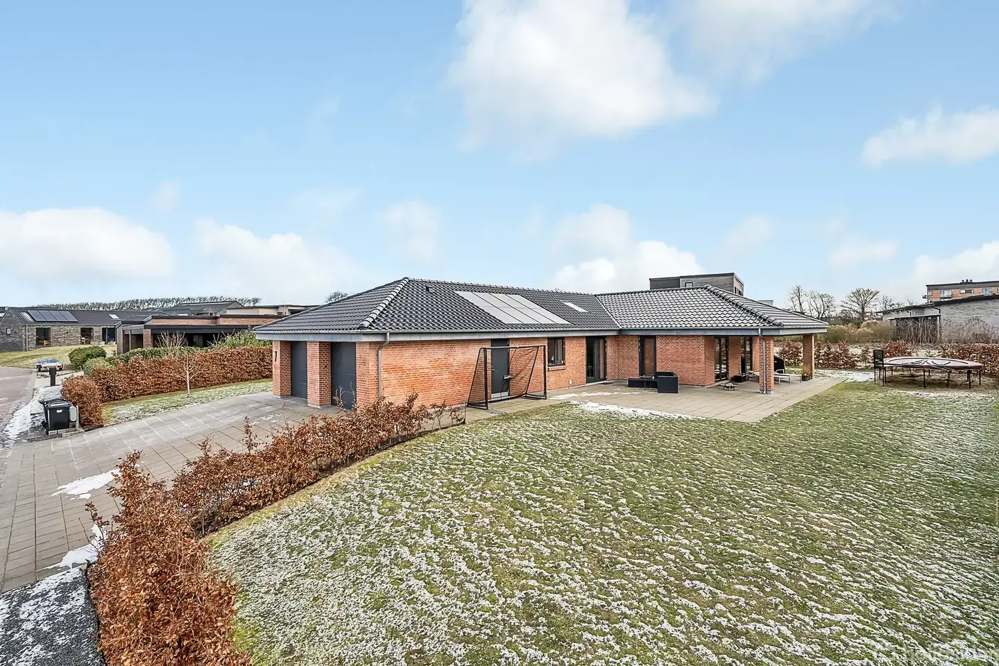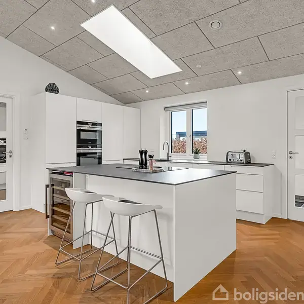 Denne flotte villa er opført i 2019 og fremstår både moderne, energivenlig og med et udvendigt fokus på minimal vedligeholdelse. Huset er bl.a. opført med træ/alu-vinduer samt udhæng i vedligeholdelsesfri fibercementbeklædning. Der er desuden tænkt i bæredygtige løsninger med solcelleanlæg og et ventilationsanlæg med varmegenvinding, som sikrer et sundt og behageligt indeklima.Boligens naturlige samlingspunkt er det skønne køkken/alrum med højt skråloft og et fantastisk lysindfald fra to ovenlys