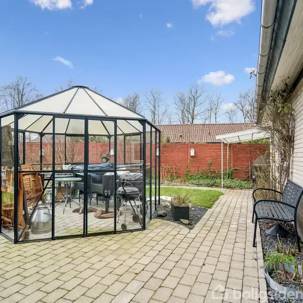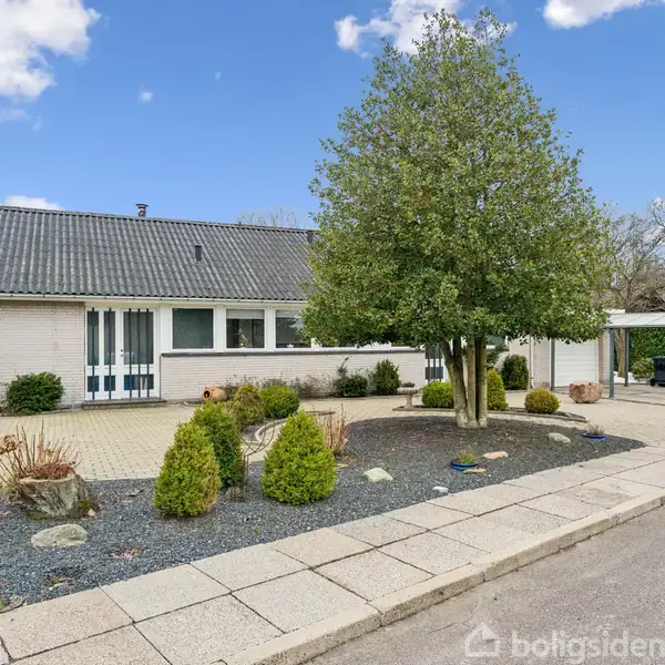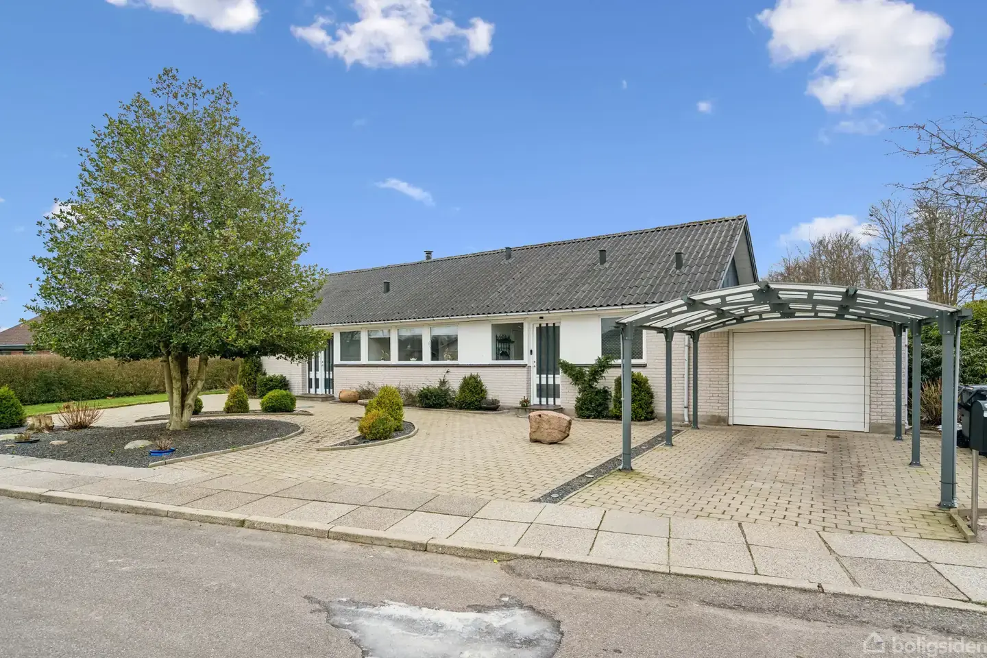 Velbeliggende vinkelbygget 1-plans villa på 159 kvm. hvortil kommer 28 kvm. muret garage med værkstedsrum. Endvidere er der carport, cirka 30 kvm. stort udhus, 2 stk. drivhuse samt flot pavillon ved terrassen. Beliggende forenden af blind vej på en 1014 kvm. stor grund med helt lukket have og sydvestvendt delvis overdækket terrasse. Kort afstand til skole, idrætshal, indkøb m.m. Villaen, der er opført i hvide kalksandsten i 1973, har eternittag, termovinduer, hvide panellofter, træ- og klinkeg