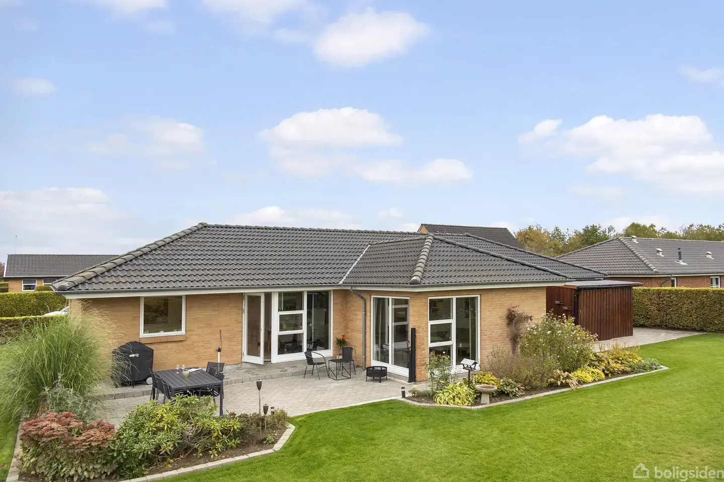 Denne villa ligger i en rolig, lukket lomme omgivet af grønne stisystemer og hyggelige fællesarealer, hvor naboer mødes omkring legepladserne – perfekt til børnefamilien, der ønsker trygge rammer og et godt lokalmiljø.Haven er lukket og ugeneret, anlagt med sydvendte terrasser, hvor der altid kan findes en lun krog i læ for vinden. Her kan du nyde både morgensolen og de lange sommeraftener. Derudover finder du to gode udhuse, hvoraf det ene er integreret i carporten – ideelt til værksted, opbeva