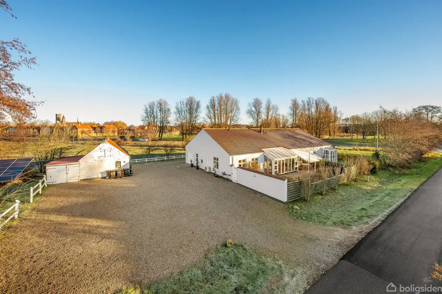 Hermed udbydes et dobbelthus på en attraktiv, bynær beliggenhed lige i udkanten af Ribe by. Her finder du en særlig ejendom, der kombinerer ro, natur og byliv på fornem vis. Fra grunden er der udsigt over byens tage og i retning mod den ikoniske Ribe Domkirke, mens den storslåede natur ved Vadehavet ligger inden for kort afstand.Ejendommen er beliggende på en imponerende grund på hele 2.329 m², som giver masser af plads, luft og muligheder. Her er der tale om en ejendom med to selvstændige bolig