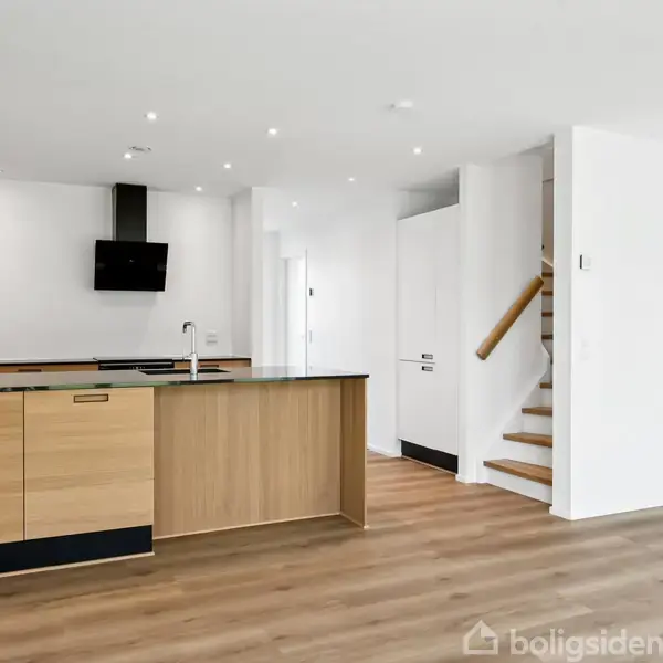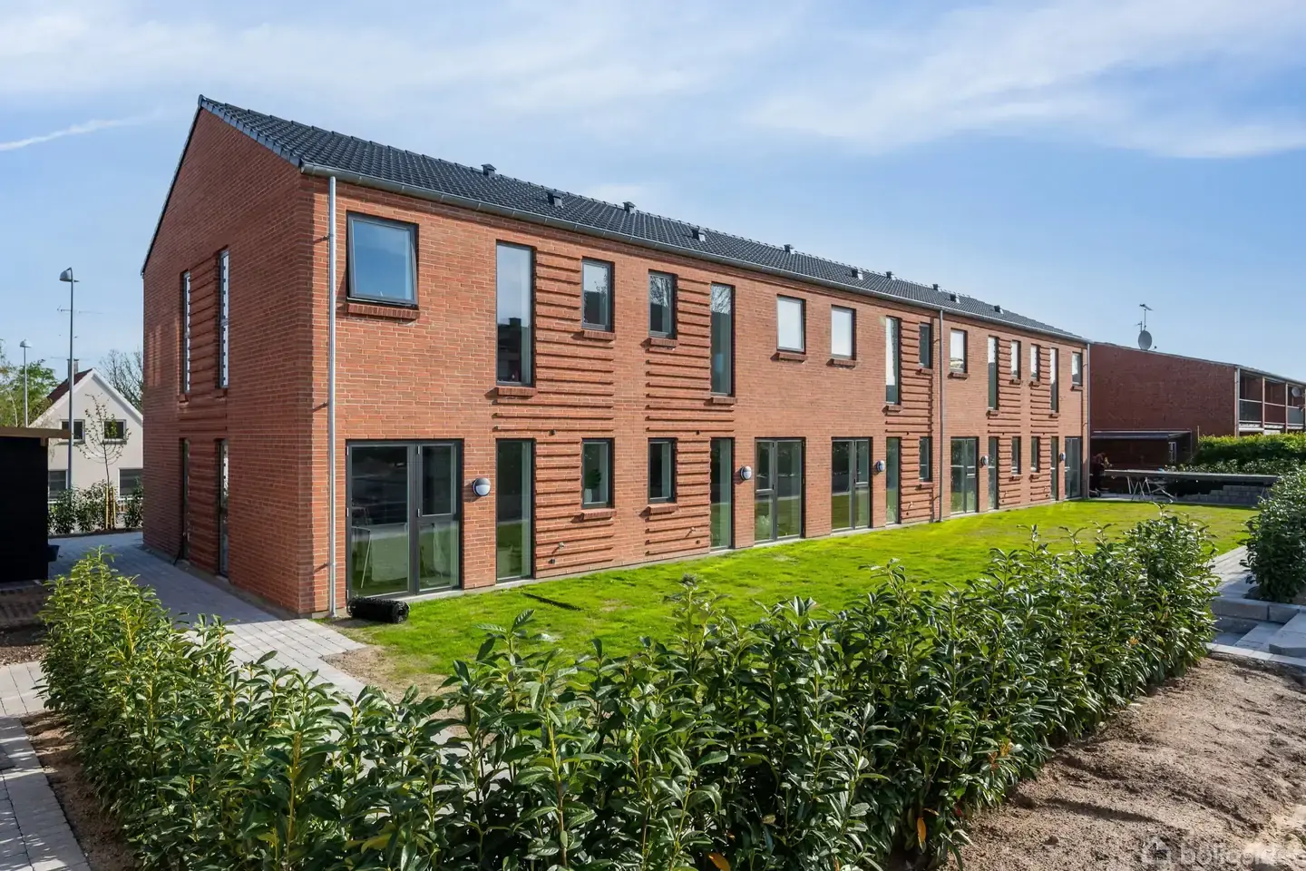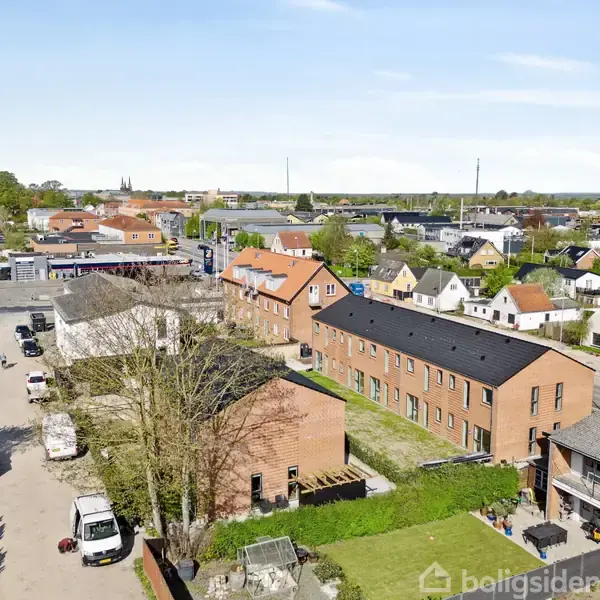 På en attraktiv og ganske central beliggenhed i Roskilde står dette moderne og nybyggede rækkehus fra 2023. Huset er opført i samarbejde med Eurodan Huse, og hvad angår æstetikken, materialerne og håndværksmæssigt er ejendommen i topklasse. De solrige udearealer er der heller ikke en finger at sætte på. Udefra fremstår rækkehuset med en flot facade med røde sten og mørkt tag.Som I træder inden døre, ankommer I til et hjem, der centrerer sig omkring det markante opholdsrum med køkken og stue i et