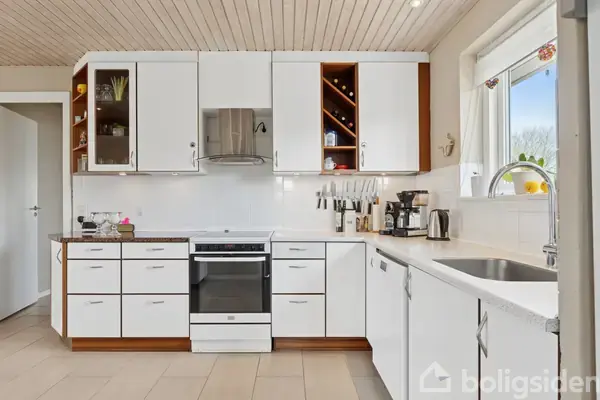 Rummelig familievilla med dejlig udsigt Denne familievilla i Bøgeskov har en rigtig fin placering med dejlig udsigt over land og by. Det gedigne hus byder på 145 kvadratmeter i ét plan, og der er blandt andet etableret hele fire værelser. Her i øvrigt både badeværelse og gæstetoilet, og hjemmet har hertil en åben opholdsafdeling og en udestue. I sidstnævnte er der klargjort til gulvvarme, og det skal desuden nævnes, at størstedelen af ejendommens vinduer og døre er udskiftet i 2009.Boligens køkk