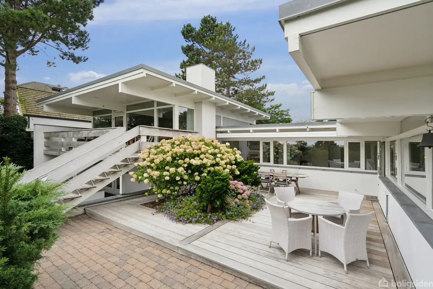 Ejendommen er beliggende med en storslået udsigt, der med sin stringente arkitektur, facader og markante vinduespartier åbner sig med en betagende udsigt over Køge Bugt - oplevet fra flere niveauer i boligenGrunden er i sig selv noget helt særligt. Ved ankomst til ejendommen, mødes man af en rummelig gårdsplads med adgang til en dobbeltgarage og dejlig vestvendt have med flere terrasser. På vej rundt om villaen afsløres den storslåede panoramaudsigt, der kan nydes fra husets mange terrasser, anl