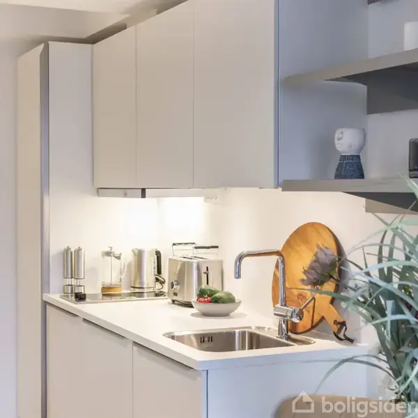 1- OG 2-VÆRELSES BOLIGER DEN GAMLE POLITISTATION på Store Kongensgade omdannes nu til moderne lejeboliger – lige midt i København K. Det bliver en arkitektonisk oase, centralt placeret i byen, med altaner og et atmosfærefyldt niveauopdelt gårdrum mod sydøst. LEJEBOLIGERNE i huset på Store Kongensgade består primært af 1-værelses studiolejligheder, hvoraf nogle har altan, samt et mindre antal 2-værelses lejligheder med altan på øverste etage. DE LYSE, MODERNE BOLIGER er indrettet med fokus på funktionalitet i en kvalitet, som er misundelsesværdig komfortabel og gør det nemt at nyde livet midt i byen. HVIDE VÆGGE, DØRE OG VINDUESRAMMER i lejlighedens store rum med god plads til både studie- eller kontorplads og kombineret sofa- og sovemiljø. Velindrettet køkkensektion til både enkle og avancerede kokkerier, og badeværelse med væghængt toilet, bruseniche og gulvvarme. ALLE DETALJER er nøje gennemtænkte, med behovet for personlig indretning for øje. BYGNINGEN på Store Kongensgade renoveres fra inderst til yderst, så den fremstår i et nyt, moderne udtryk. De eksisterende facader omdannes med facadebeklædning i den smukke tombak – et materiale, som i sin gyldenbrune farve ligner kobber og som bringer en livlig og bestandig signatur til facadeudtrykket. FACADERNE fremstår både glatte og perforerede og leger dermed elegant med lys og æstetik, ligesom de store vinduespartier, som fra gulv til loft inviterer lys i massevis indenfor. De fem øverste lejligheder mod Store Kongensgade har altaner, som er afskærmet fra naboen og med plads til møbler. DE UDVENDIGE VINDUESRAMMER udføres i farvet aluminium, som tone-i-tone lægger sig op ad tombakken. På den måde stråler arkitekturen med sin egen unikke og harmoniske identitet. MOD GÅRDEN øges bygningskroppen med påmonterede ’kassetter’ som er henholdsvis åbne og lukkede i et skiftende forløb. Huset ’springer’ således i et livligt udtryk mod gårdmiljøet og lader lyset vandre på skift ind og ud af alle boligerne, understøttet af facadens gyldne materialitet, farvespil og de store vinduespartier. Flere af lejlighederne er udstyret med hyggelige altaner mod det skønne gårdrum. HUSETS HØJE STUEETAGE indrettes til dagligvarebutik, med adgang fra Store Kongensgade, og politistationen fra 1970’erne vil således fremover markere sig som en stolt og raffineret bygning, med en både funklende og hensynsfuld fremtoning i gadebilledet og blandt den omkringliggende klassicistiske arkitektur. OMRÅDET omkring boligerne på Store Kongensgade er blandt byens mest eftertragtede. Gamle palæer og herskabelige ejendomme blander sig med nyrenoverede butiksfacader, yogastudier og et væld af gastronomiske oplevelser på den kendte gade, der blev til i år 1650 og strækker sig fra Østerport. Station til Kongens Nytorv, som den vestligste trafikåre i Københavns ældste bydel, Frederiksstaden. HER STORTRIVES BYLIVET i alle afskygninger, tæt på nogle af hovedstadens ypperste attraktioner – få meter fra Marmorkirken og blot en kort gåtur fra bl.a. Nyhavn, Ofelia Beach og Toldboden. Så når byturen tager fat på de lyse timer, er der ikke langt hjem! Løbeture på Kastellet, i Kongens Have eller langs havnefronten. Shopping og hyggelige kaffebarer. Gallerier, fitnesscentre og søndagsbrunch med vennerne. Lejeperiode min. 9 måneder + 3 måneders opsigelse. BEMÆRK at billederne er fra en prøvebolig.