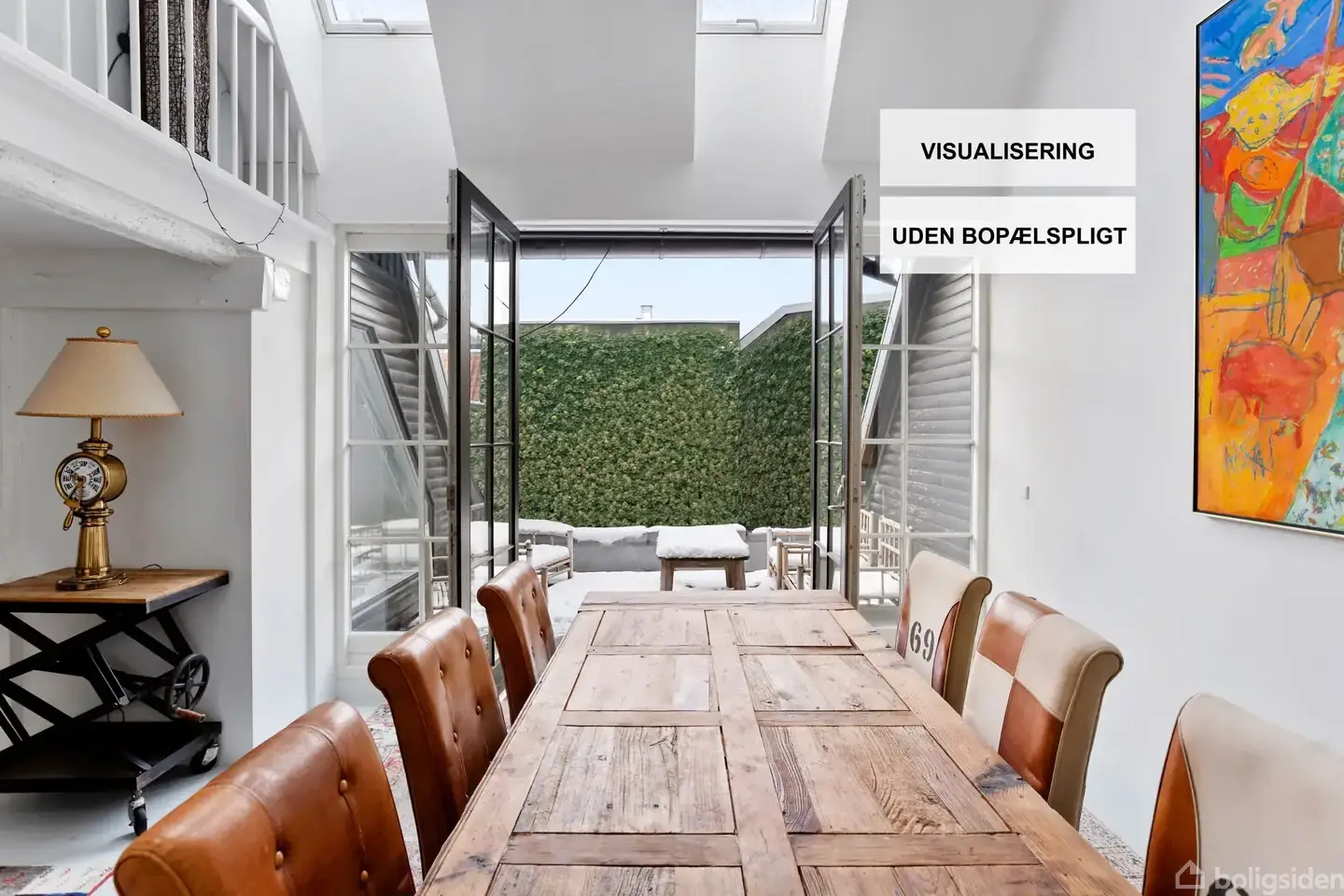 Uden bopælspligt er som et åbent vindue i kalenderen. Altså et sted, der ikke tjekker, hvornår man kommer hjem. Bo her det hele eller halve af året, bo her i weekenden, bo her om sommeren, om vinteren, eller når man bare tilfældigvis smutter en tur til København én dag eller 2 for at gå en tur i byen. Ja, uden bopælspligt, det står der på skiltet til lejligheden i den tidligere spiritusfabrik med den lækre adresse Store Kongensgade 110H. Oplagt til udenlandsdanskeren, der bruger den som et pitstop, eller bohemen, hvis kalender er en antydning, ikke en aftale. Eller måske den travle forretningsmand, undskyld, forretningsperson, som måler tiden i møder, fly, ankomstterminaler og hurtig kaffe. Adressen her i Indre By bliver ikke meget bedre. Store Kongensgade fra Nyboder og Esplanaden er ensrettet ned til Kongens Nytorv. Historisk charme Alt er en gåtur væk, caféerne, restauranterne, Marmorkirken, Metro, Odd Fellow Palæet, Sankt Annæ Plads, Ofelia Plads, Skuespilhuset, Dronningegården og Kongens Have med Rosenborg Slot, Restaurant Orangeriet og Hercules, Østre Anlæg. Med Kastellet og Churchillparken i den ene ende og balletten i Det Kongelige Teater i den anden kombinerer Store Kongensgade den historiske charme med det moderne byliv. Masser af lys Ejendommen er fra 1832. Lejligheden er en duplex med højt til loftet, ligger øverst på 4. sal og er på 141 m2. Der er masser af lys og udsigt over byens tage heroppe. Alt er en fest for øjet, alt står snorlige med udgang til tagterrasse, nemlig, hele herligheden er lige til at flytte ind i. Den ligger inde i baggården, her er der stille som i en lille landsby.