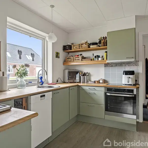 Ejendom på 108 boligkvadratmeter, med 60 kvm stor opvarmet garage samt værksted med bynær placering. Ejendommen har fået nyt tag i 2017 inkl. Zinktagrender. Ejendommen er ligeledes udstyret med træ vinduer med energirude fra 2008. Ejendommen står i yderst flot stand, det vil sige at murværk er i orden. Garage og udhæng er nymalet. Udestuen er med termoruder, og fremstår i brugbar stand.Indvendigt:EntreBryggers - med vaskesøjle og gulvvarmeFordeler gang Badeværelse fra 2008 med gulvvarme Toilet f