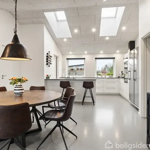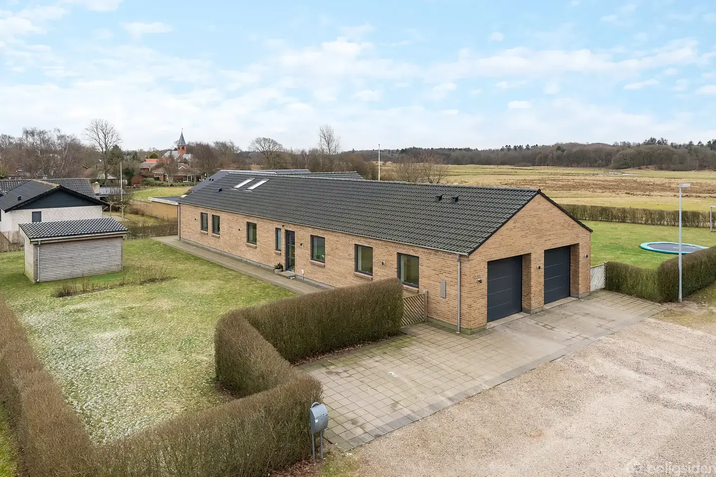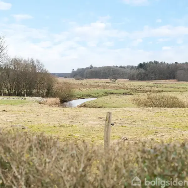 På en lukket og fredelig vej i Hodsager finder I denne gennemførte villa fra 2013, hvor naturen spiller hovedrollen. Her bor I i første række til Storåen og Stoubæk Krat, med en udsigt der følger jer udenfor, såvel som indenfor – og som kun bliver smukkere, jo længere dagen skrider frem.Allerede ved første skridt indenfor mærker man, at intet er overladt til tilfældighederne. Materialevalg og løsninger er gennemtænkte, og boligen er spækket med komfort: centralstøvsuger, Genvex-anlæg, træ/alu-vi