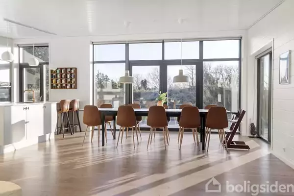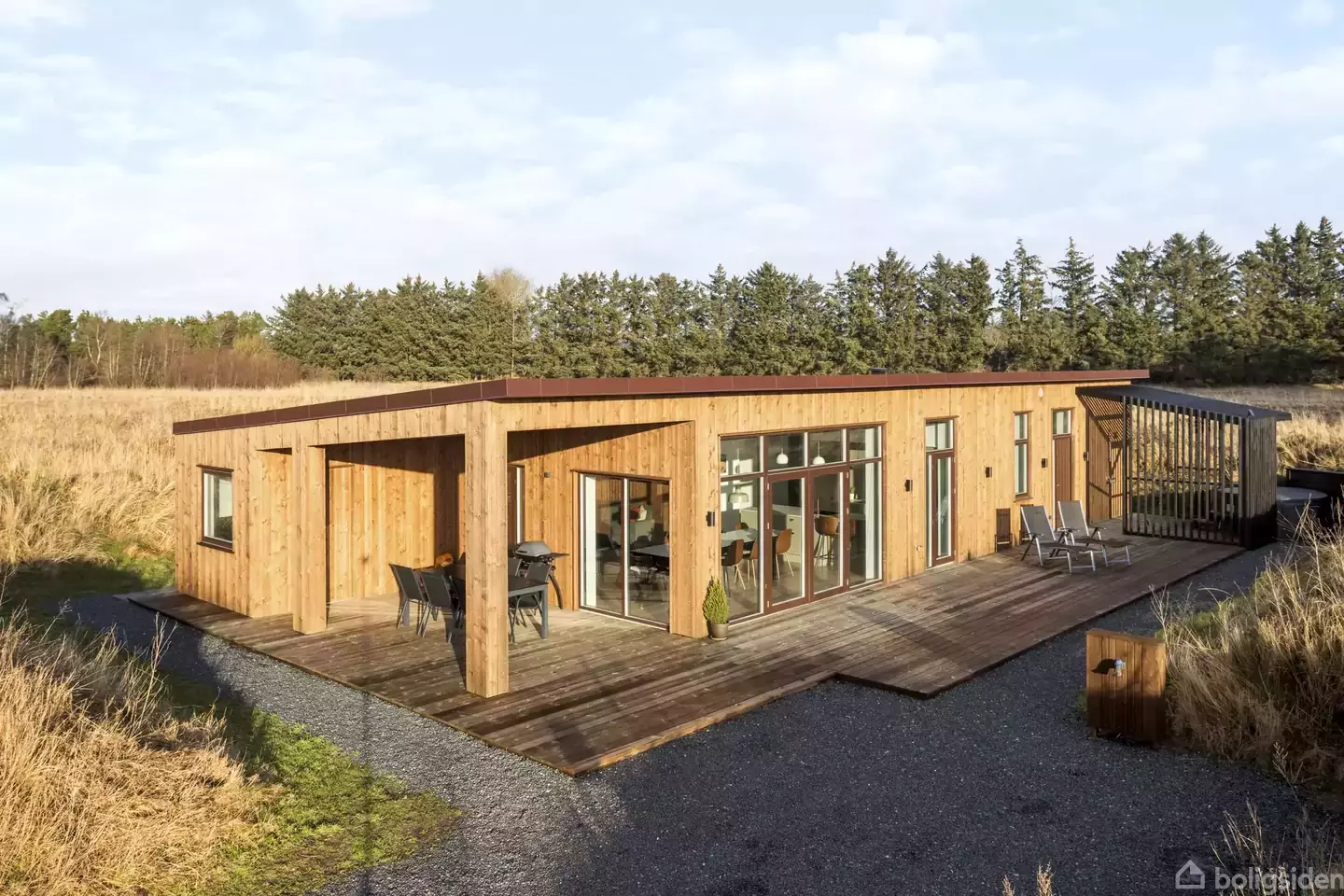 Denne indflytningsklare villa på Strandhusene 6 i Tversted, opført i 2023, er et smukt eksempel på moderne arkitektur, hvor kvalitet og materialevalg spiller en central rolle. Boligen er designet med ensidet taghældning (forberedt til sedumtag), der skaber både visuel interesse og en åben, indbydende atmosfære indendørs. Grænbeklædningens naturlige glød giver huset et varmt og tidløst udtryk, mens de store vinduer sikrer et fantastisk lysindfald og en tæt forbindelse til naturen udenfor.Indretni