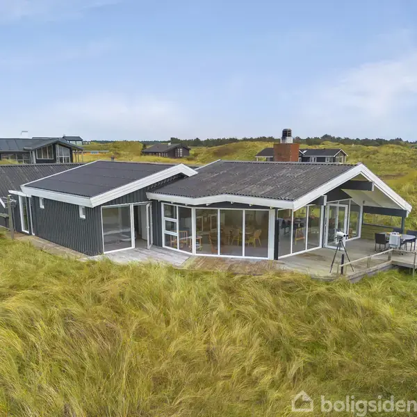 Lige ude midt i klitterne på vesterhavskysten kan I nyde noget af den mest spændende natur, som Danmark har at byde på, i et stort fritidshus med udsigt til vandet og en horisontlinje, der ligger 25 kilometer fra husets panoramavinduer.Når I sætter kikkerten for øjet inde fra stuen eller ude på terrassen, er der fri og uhindret udsigt til livet ude på vandet med de mange skibe og til det rå, omskiftelige og fascinerende klitlandskab, hvor nabohusene ser ud som om de ligger spredt tilfældigt ud i