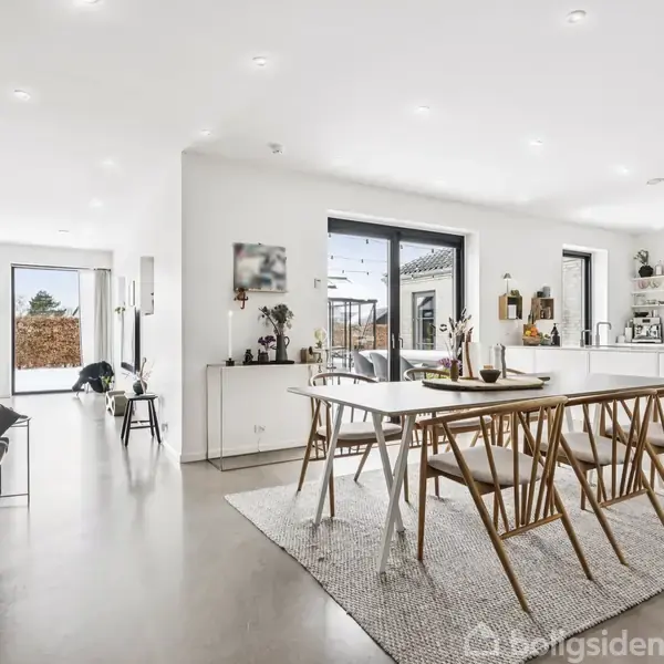 INDRETNING Boligen fremstår lys, moderne og gennemtænkt fra første skridt indenfor. Entréen er rummelig og praktisk indrettet med god plads til hverdagens behov og leder naturligt videre til husets samlingspunkt – det store køkken/alrum. Her mødes æstetik og funktionalitet i et stilrent Svane køkken med hvide, grebsfrie fronter, elegante materialer og masser af bord- og opbevaringsplads, hvor alle skabe indeholder praktiske skuffer. Store glaspartier sikrer et fantastisk lysindfald og åbner hjem